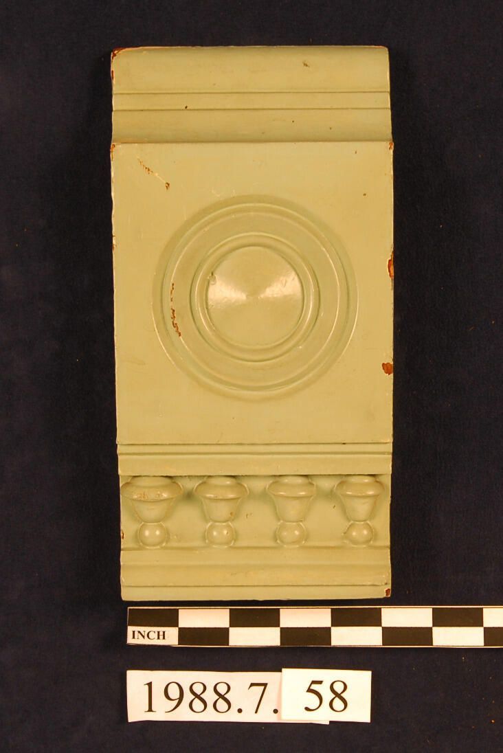 Rectangular corner block. Molded top edge. Lower front has series of half-turned spindle decorations with molded edges. Bulls eye center. Painted. Inscriptions or Markings: Manufacturer: Place of Manufacturer: Design motif: Style: Finish: Painted.