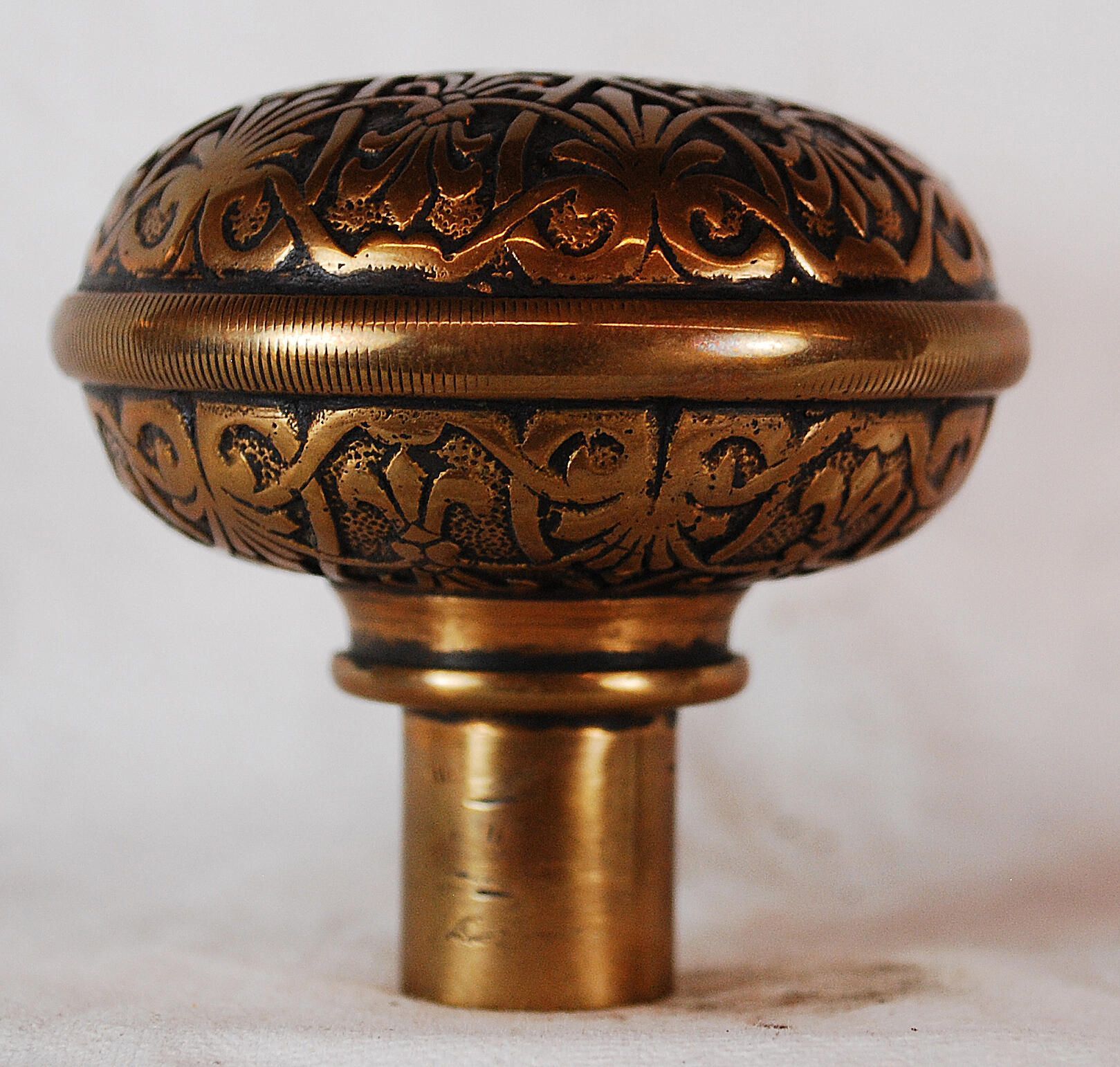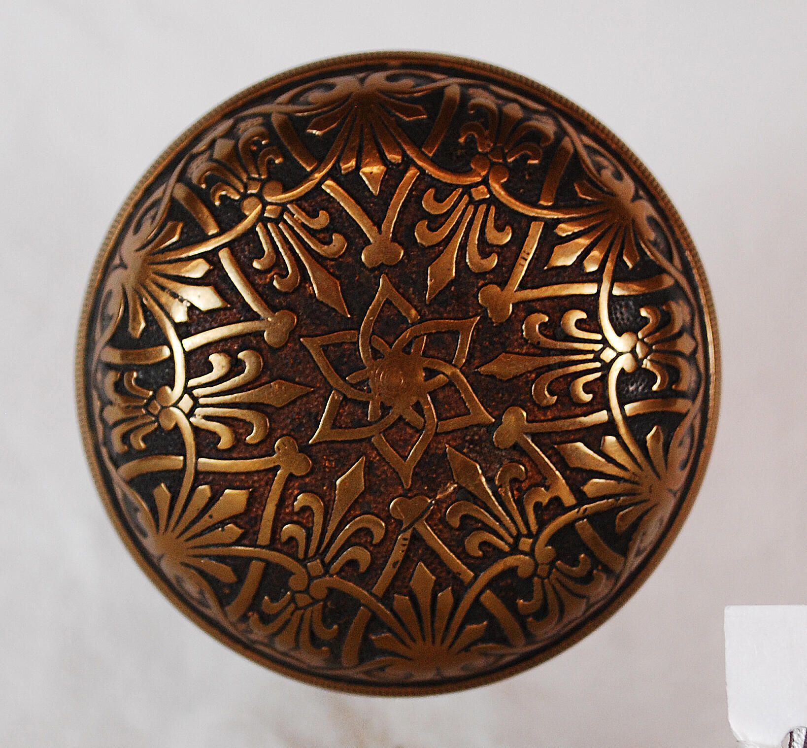 Design Name: J - 103 Gothic Manufacture: Yale & Towne Mfg. Co. Style: Neo-Grec Material: Bronze Manufacturing Method: Cast Surface Finish: Aged / Bronze VDA Classification: Sixfold Symmetry VDA Number: J - 103 Shape: Domed Patent Specifics: Lock Type (If Applicable): Inscription/Makers Mark: Inscription Text: Comments: Striations on Center Band of Knob. Beautiful Crisp Detail.