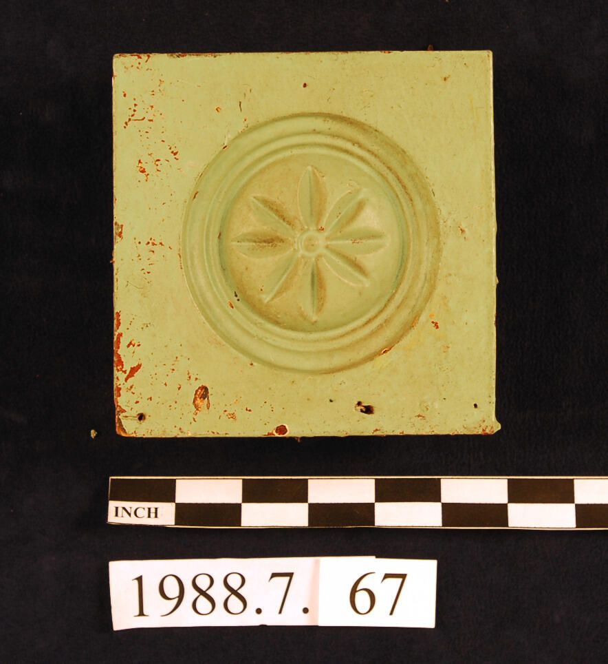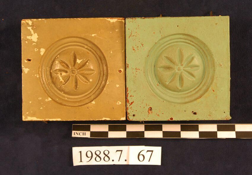 One lot of two square corner blocks. Rosette center. Spoon-cut ornament. Pine? Painted. Square nails. Inscriptions or Markings: Manufacturer: Place of Manufacturer: Design motif: Style: Finish: Painted.