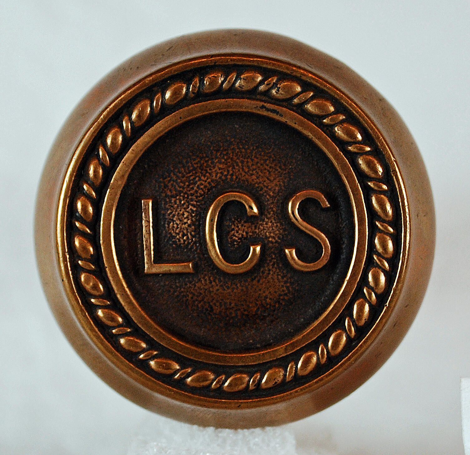 Design Name: Manufacture: . Style: Material: Bronze Manufacturing Method: Cast Surface Finish: Aged VDA Classification: Emblematic VDA Number: O - 427 Shape: Round With Flat Top Patent Specifics: Lock Type (If Applicable): Inscription/Makers Mark: Inscription Text: Comments: From Schmidt Tower in Seattle, Washington.