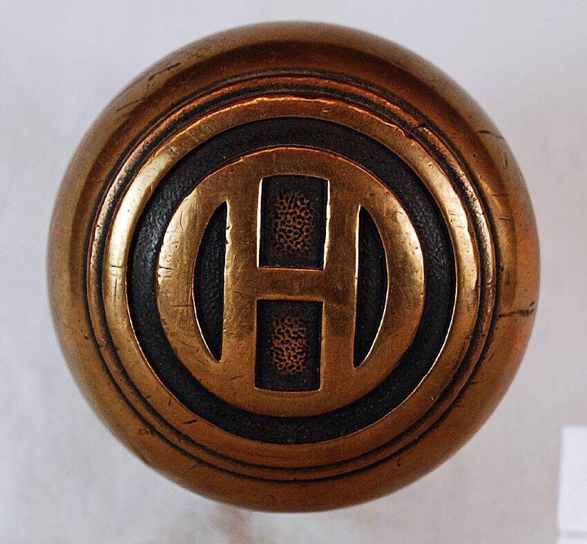 Design Name: Manufacture: . Style: Material: Bronze Manufacturing Method: Cast Surface Finish: Original Polish VDA Classification: Emblematic VDA Number: O Shape: Domed. Round With Flat Top Patent Specifics: Lock Type (If Applicable): Inscription/Makers Mark: Inscription Text: Comments: Initials "H + O" in Center Design.