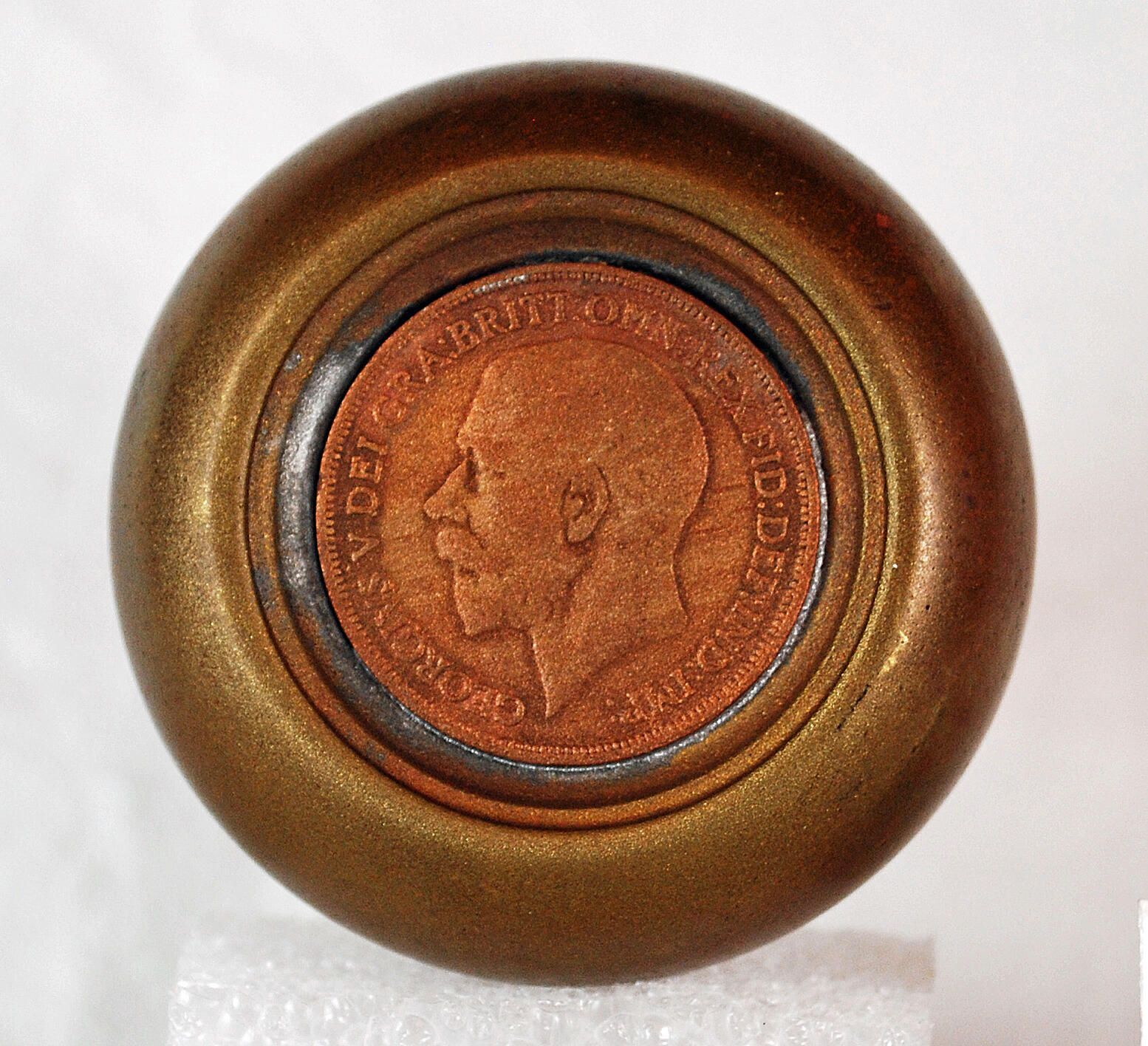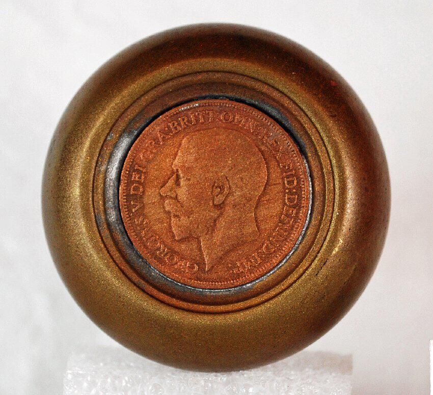 Design Name: Manufacture: . Style: Novelty Material: Brass Manufacturing Method: Stamped Surface Finish: Unpolished VDA Classification: VDA Number: Shape: Domed. Flat Face. Patent Specifics: Lock Type (If Applicable): Inscription/Makers Mark: Inscription Text: Comments: British Penny in Face. Three Piece. Threaded Shank.