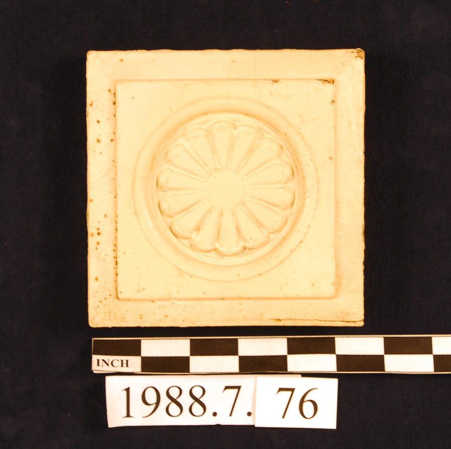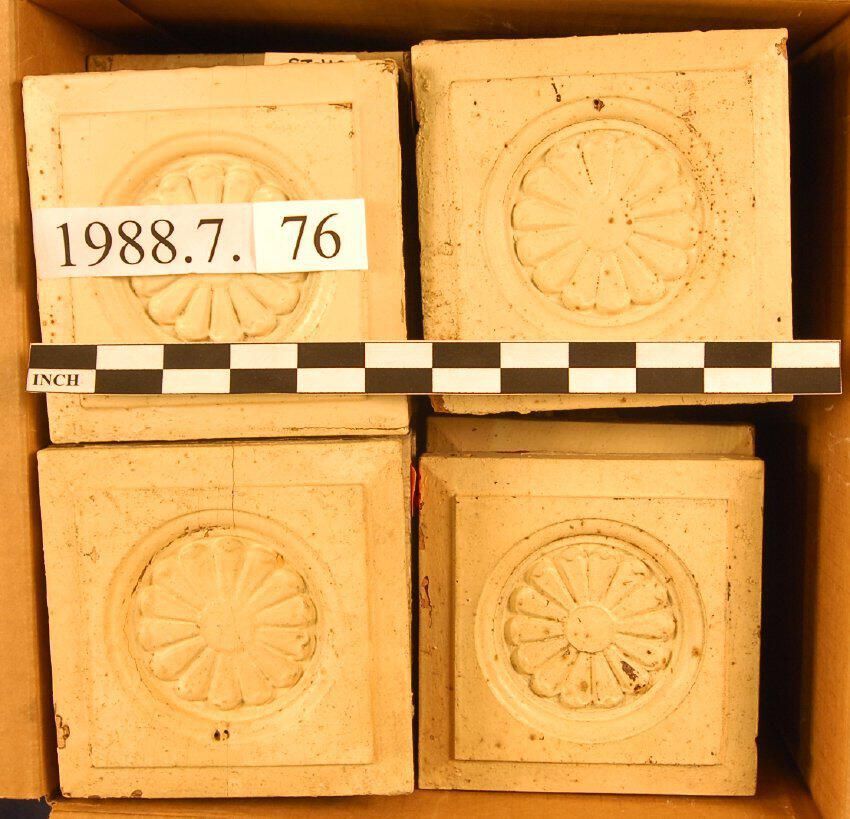 One lot of thirty-one square corner blocks. Circular recess with applied floral motif. Bevelled edges. Pine? Painted. Some square nails. Extant. Some with minor missing edges. One block has penciled inscriptioin.