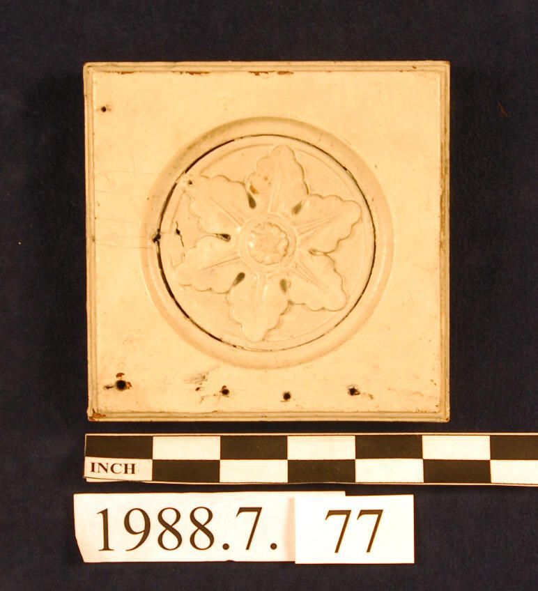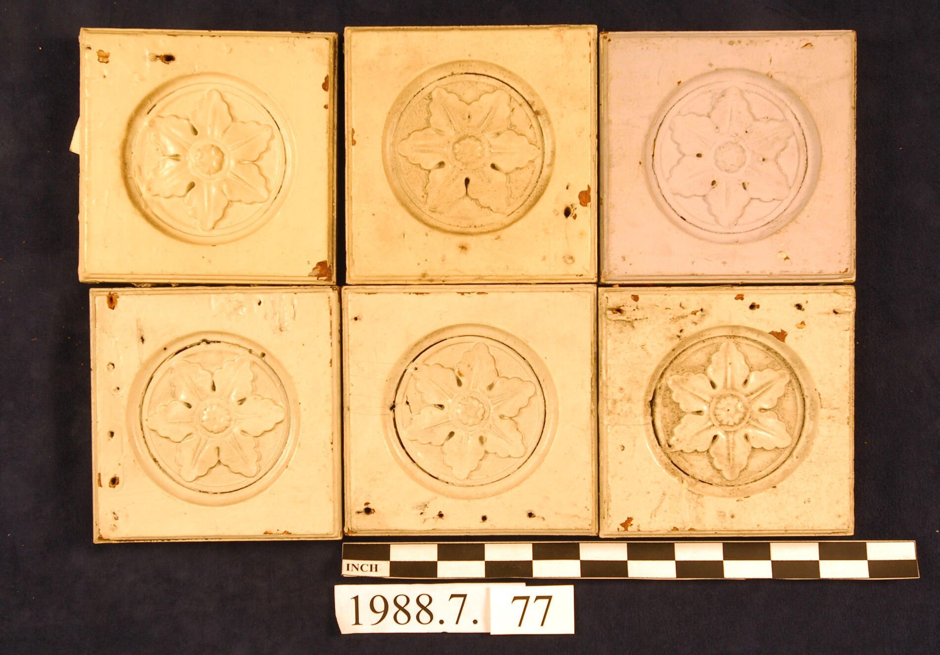 One lot of six square corner blocks. Circular recess. Applied floral ornament. Molded edges around block. Cedar. Painted. Inscriptions or Markings: Manufacturer: Place of Manufacturer: Design motif: Botanical. Style: Finish: Painted.