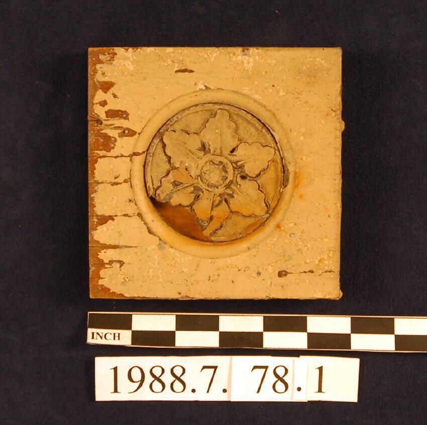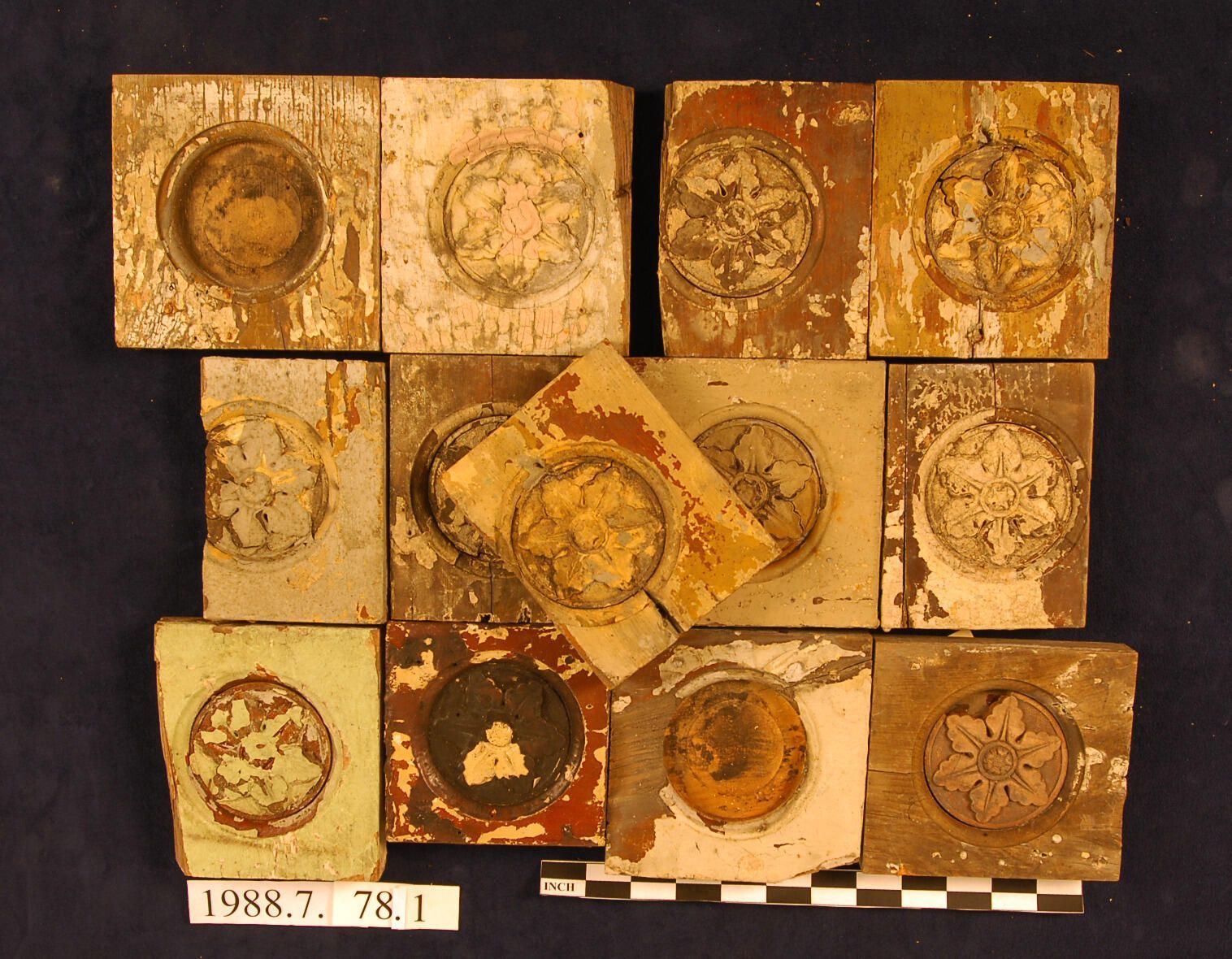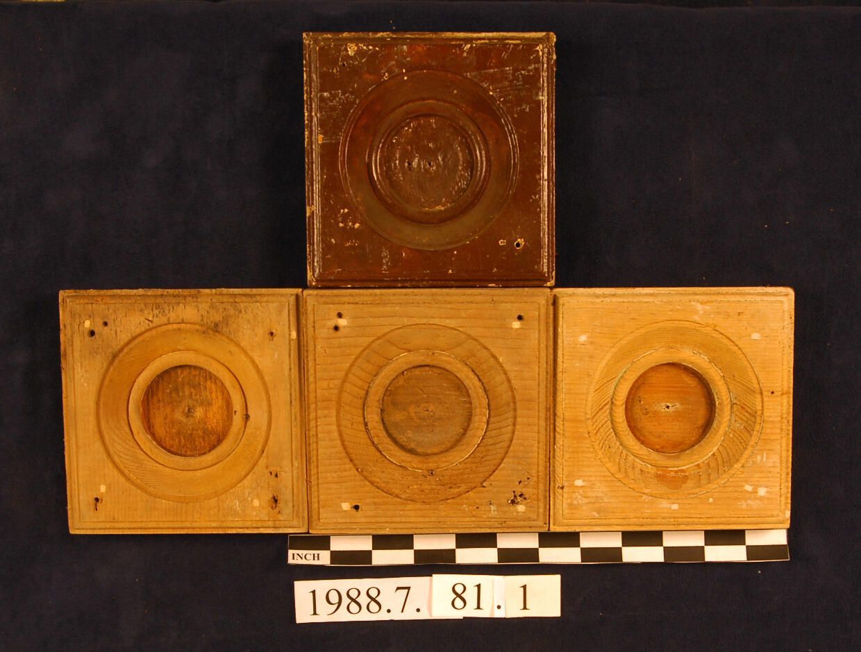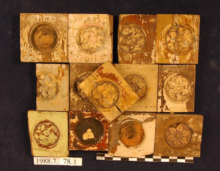 One lot of thirteen square corner blocks. Circular recess. Applied floral Ornament. Unidentified wood. Painted. Some blocks incomplete - others cut down. Some missing segment of Ornament. Same pattern as 1988.7.78.