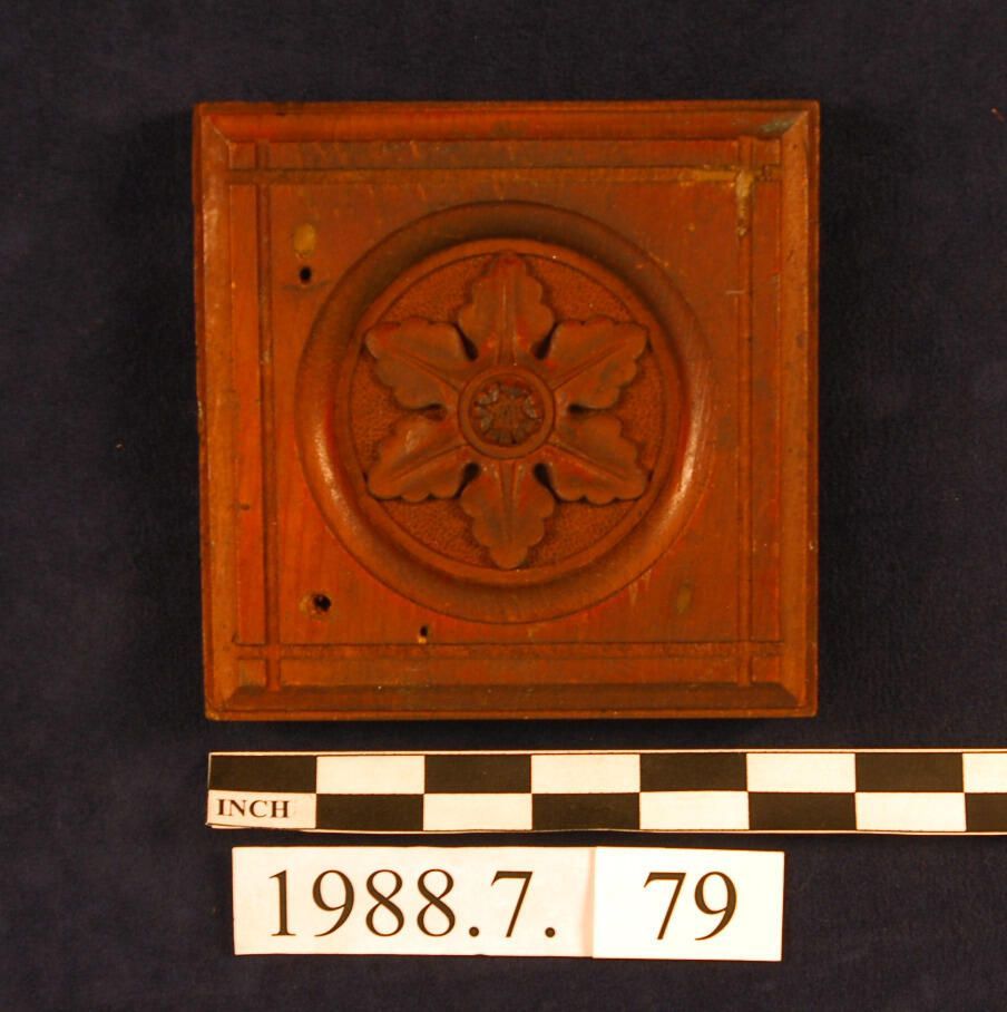 Square corner block. Circular recess. Applied floral motifoOrnament. Molded edges. Crossed line border. Unidentified wood. Varnished. Square nails. Inscriptions or Markings: Manufacturer: Place of Manufacturer: Design motif: Botanical. Style: Finish: Varnished.