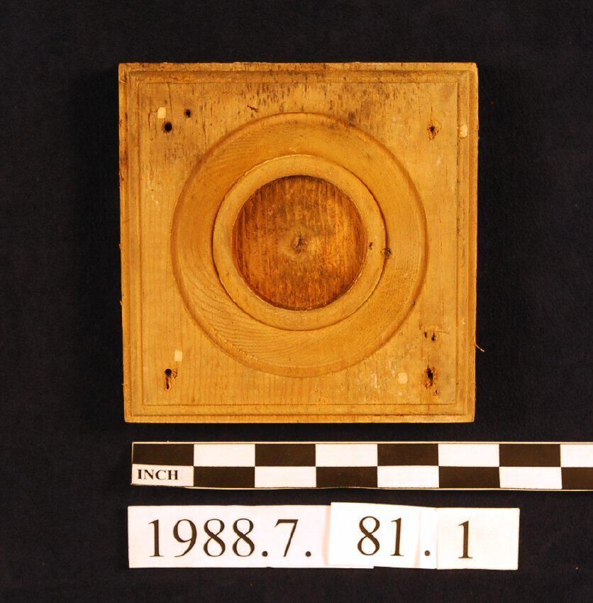 One lot of four square corner blocks. Circular recess. Applied ornament missing. Molded edges. Unidentified wood. One is painted. Three are stripped. Some with square nails.