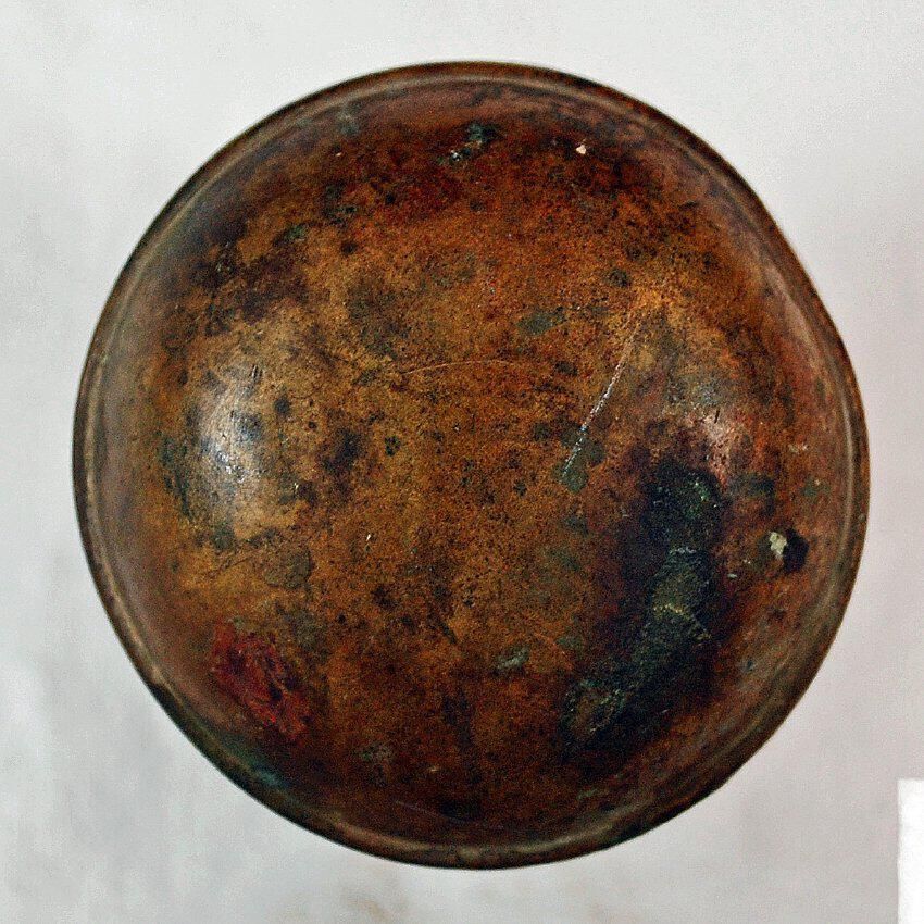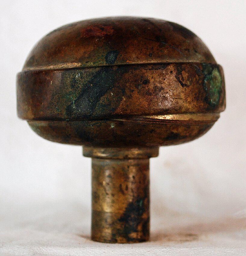 Design Name: Manufacture: Style: Vernacular Material: Brass Manufacturing Method: Pressed. Surface Finish: Unpolished VDA Classification: VDA Number: Shape: Domed Patent Specifics: Lock Type (If Applicable): Inscription/Makers Mark: Inscription Text: :Patent: Comments: Cast Shank. Dent on Rim. Corrosion.