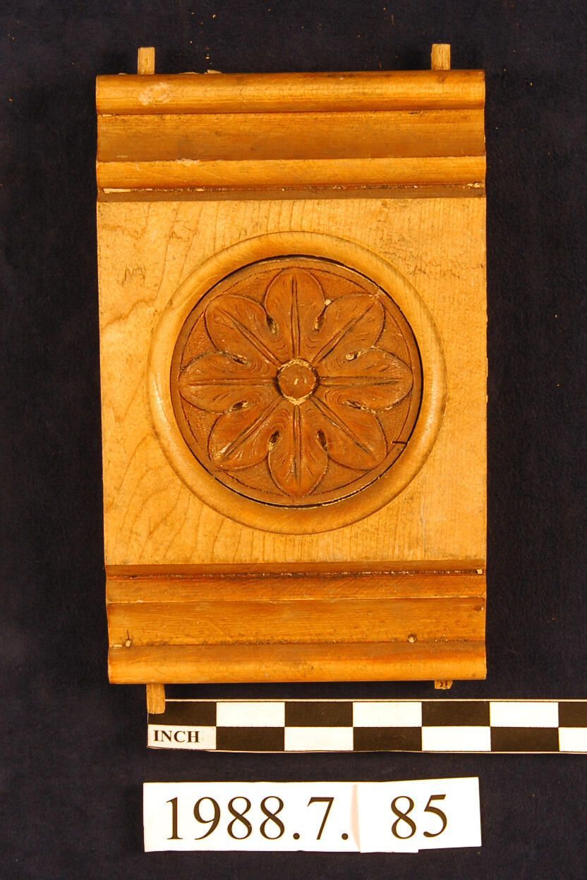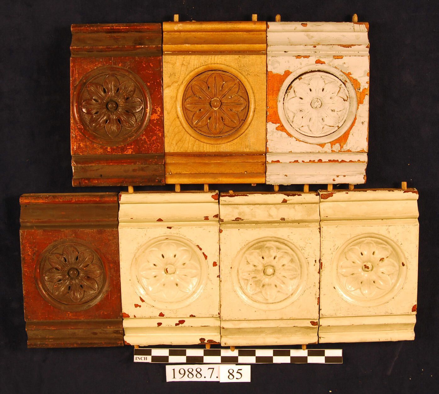 One lot of seven rectangular corner blocks. Molded on front of top and bottom edges. Circular recess with applied botanical / floral ornament. Hardwood - possibly Maple. Four are painted. One is refinished. Two are varnished. One is missing edge. Some with wire nails. Some with square nails.