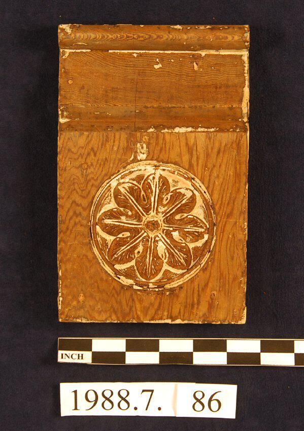 Rectangular corner block. Molded on one front edge. Circular recess with applied botanical / bloral ornament. Cedar? Remnants of paint. Inscriptions or Markings: Manufacturer: Place of Manufacturer: Design motif: Botanical. Style: Finish: Painted.