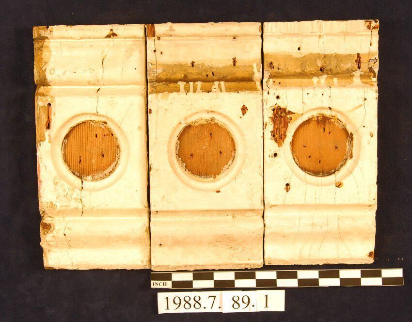 One lot of three rectangular corner blocks. Molded on front of bottom and top edges. Circular recess. Applied ornaments are missing. Cedar. Painted. Inscriptions or Markings: Manufacturer: Place of Manufacturer: Design motif: Style: Finish: Painted.