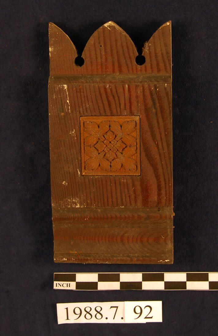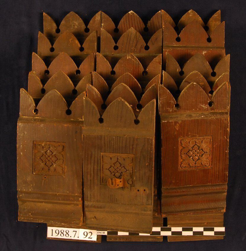 One lot of twenty-two rectangular corner blocks. Crown shaped finial top. Lower front piece is molded. Central part of blocks have square recess with applied botanical motif.One block with ornament missing. Cedar. Varnished. Wire nails. Two have curtain rod hardware.