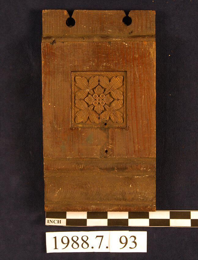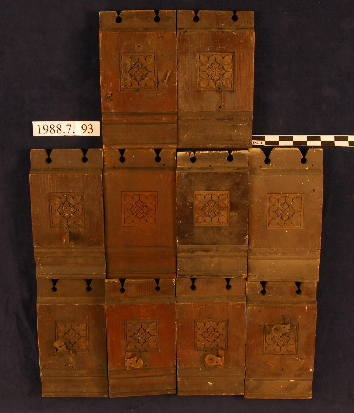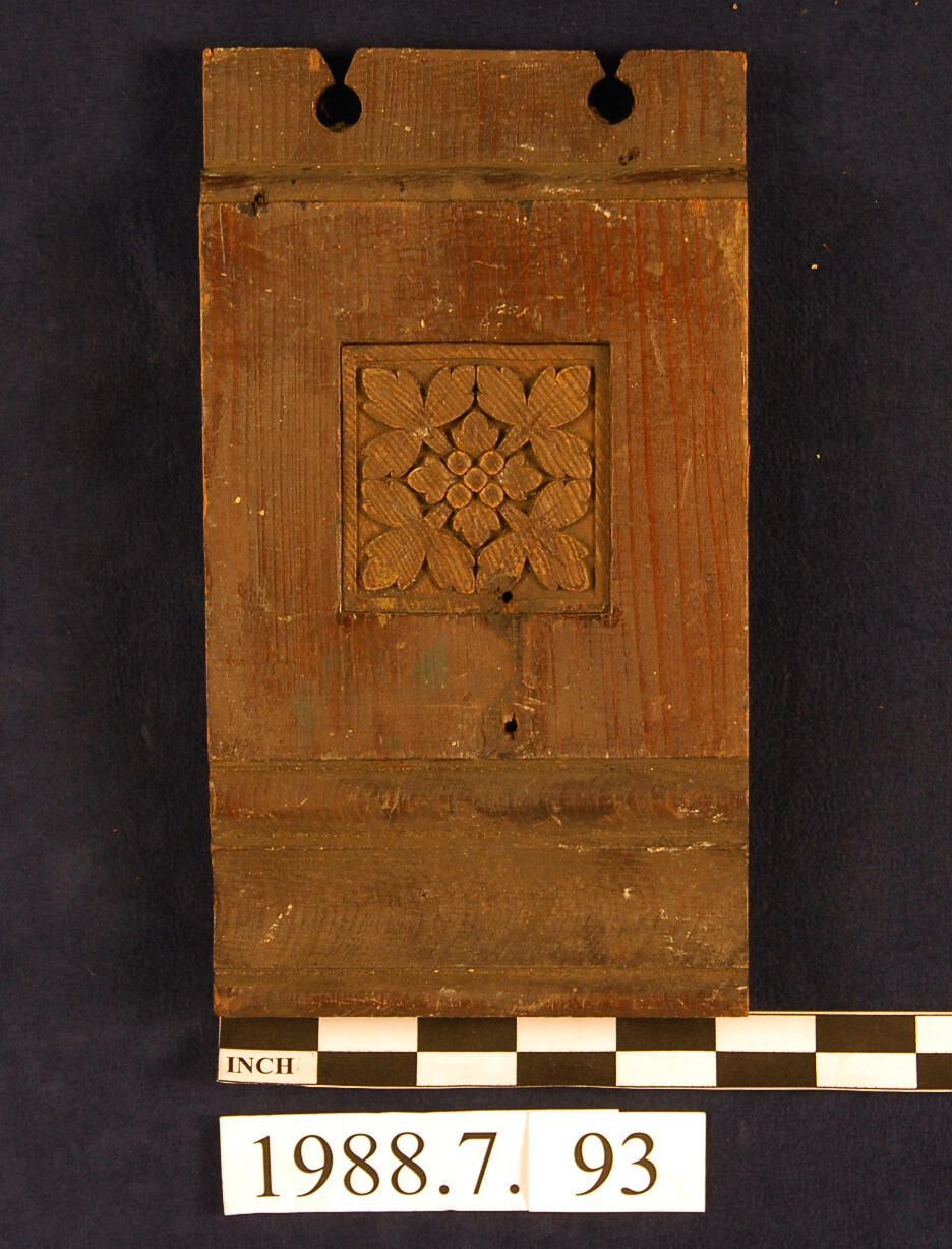 One lot of ten rectangular Corner Blocks, with modified crown finial top. Molded upper and bottom front edges. Central part of block has square recess with botanical motif ornament. Cedar. Varnished. Round nails. Five have curtain rod hardware.