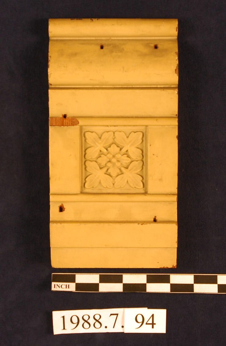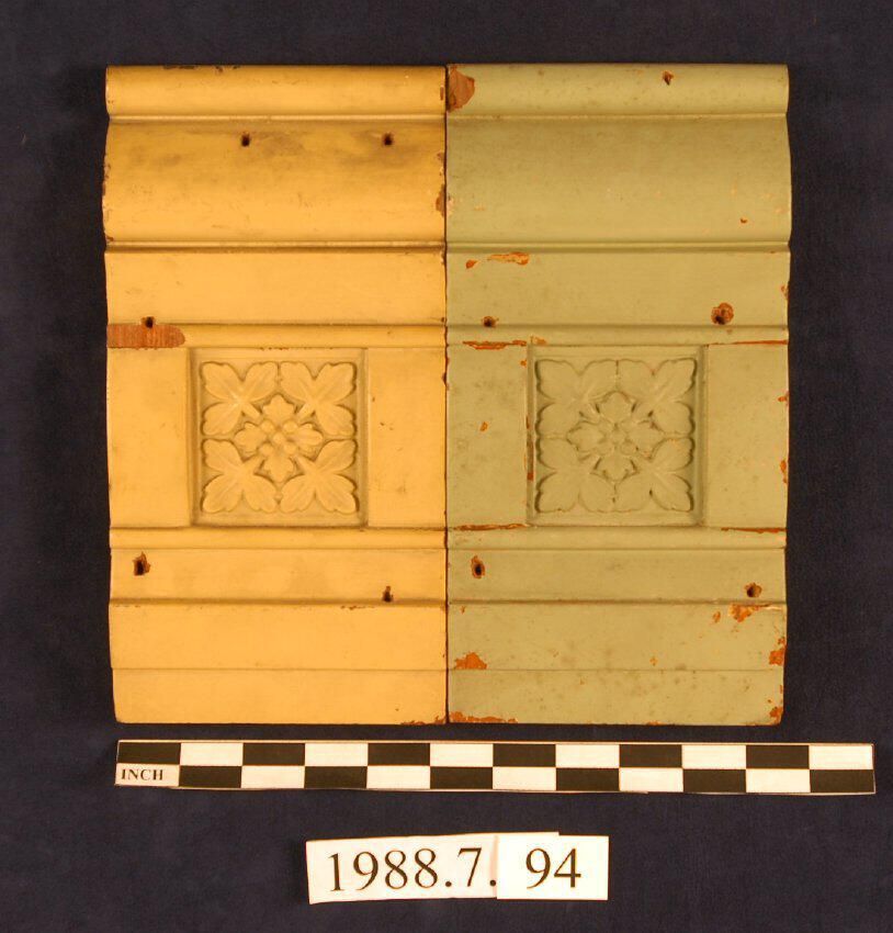 One lot of two rectangular corner blocks. Molded front. Central part of block has square recess with square botanical motif ornament. Cedar. Painted.