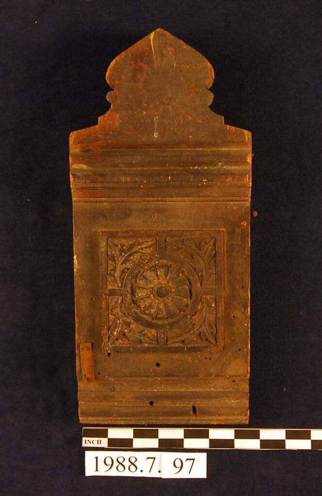 Rectangular corner block. Cut. Contoured finial. Molded edges near top and at bottom of block. Applied square ornament with carved leaf and central pin-wheel motifs. Cedar. Varnished. Has square nails.
