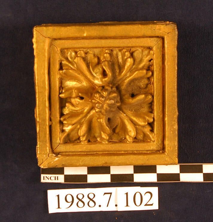 Corner block. Square frame with mitred corners. Central block with carved leaf and berry motifs. Pine? Painted with gold colored paint. Square nails. Matches 1988.7.101 and 1988.7.103.