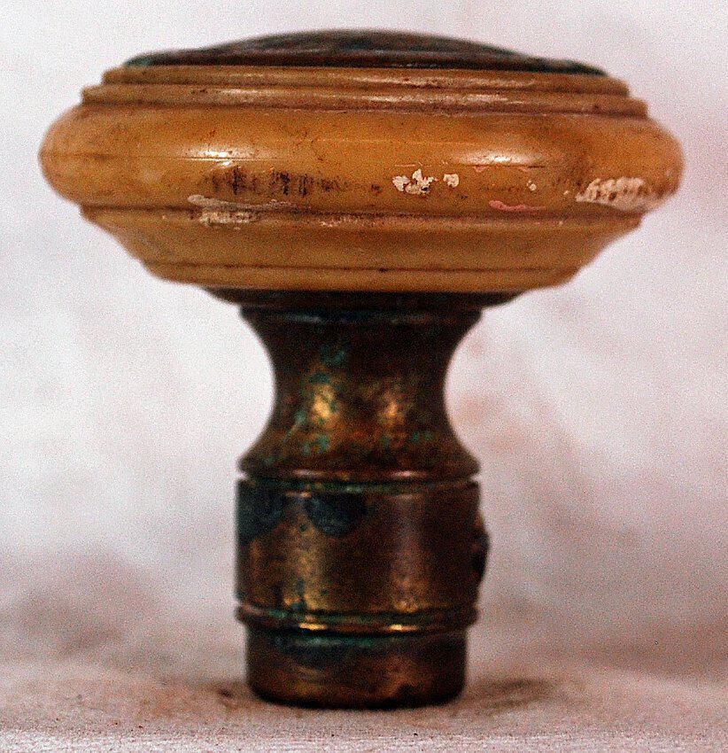Design Name: Manufacture: Style: Streamline / Moderne Material: Celluloid, Brass Shank. Manufacturing Method: Surface Finish: VDA Classification: VDA Number: Shape: Patent Specifics: Lock Type (If Applicable): Inscription/Makers Mark: Inscription Text: : Comments: