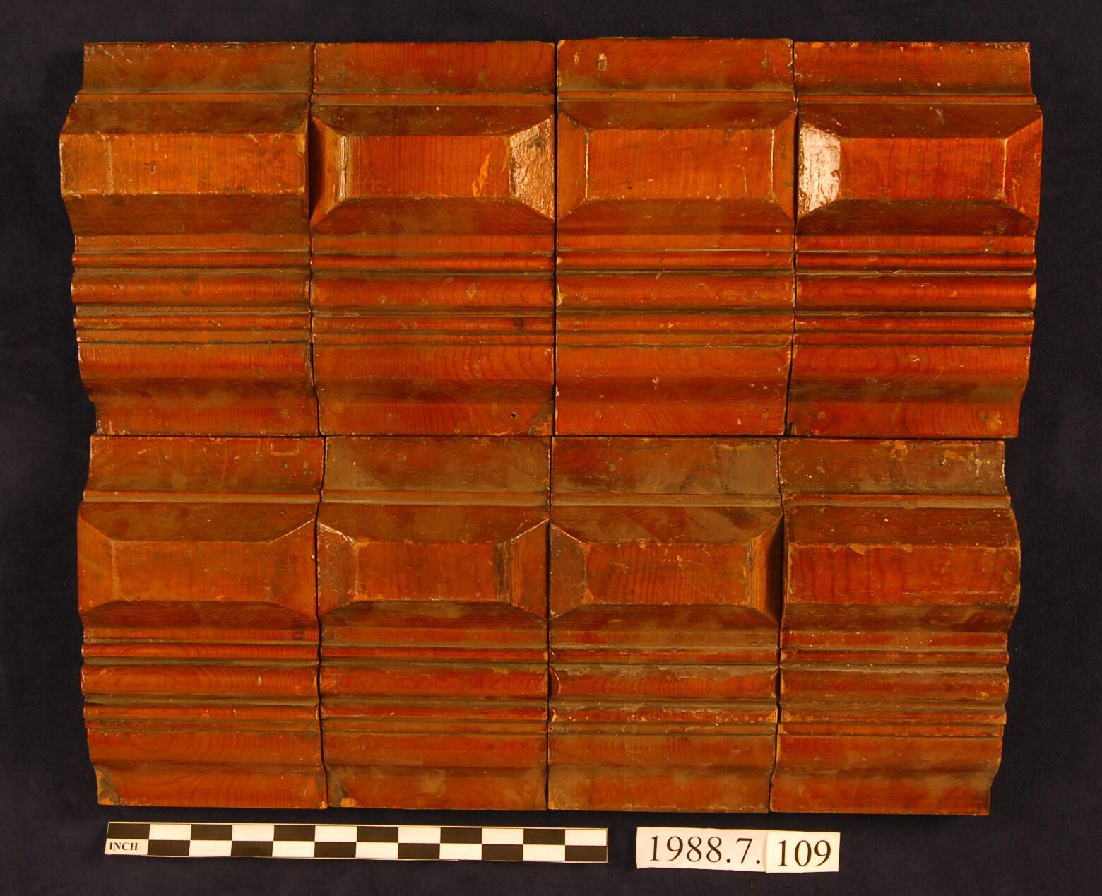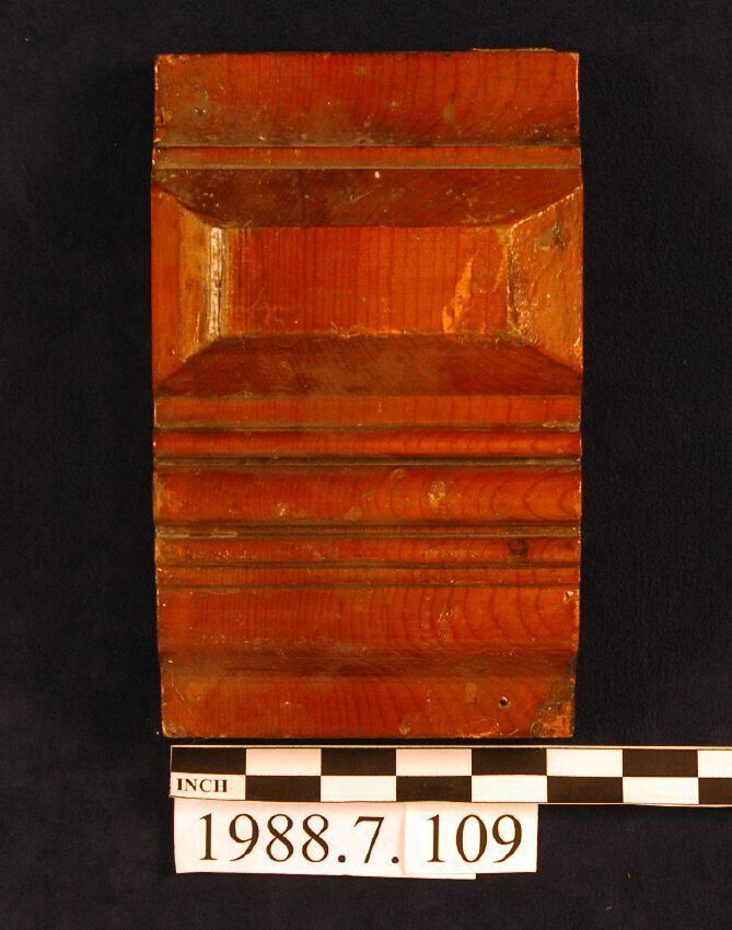 One lot of eight rectangular corner blocks. Compound molded profile across entire front. Beveled rectangular motif. Varnished. Inscriptions or Markings: Manufacturer: Place of Manufacturer: Design motif: Style: Finish: Varnished.