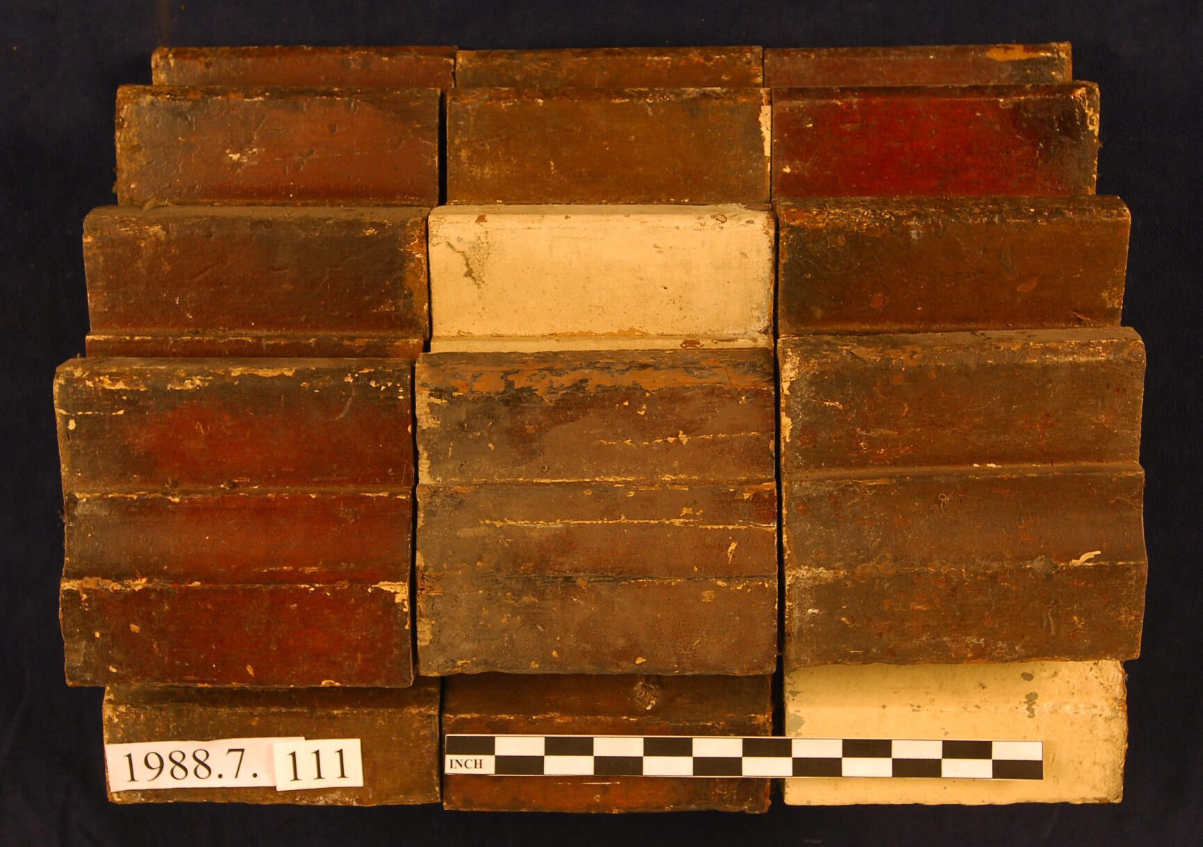 One lot of twenty-one rectangular blocks with applied cove molding. Cedar. Four are painted. Seventeen are varnished. Inscriptions or Markings: Manufacturer: Place of Manufacturer: Design motif: Style: Finish: Painted / Varnished.
