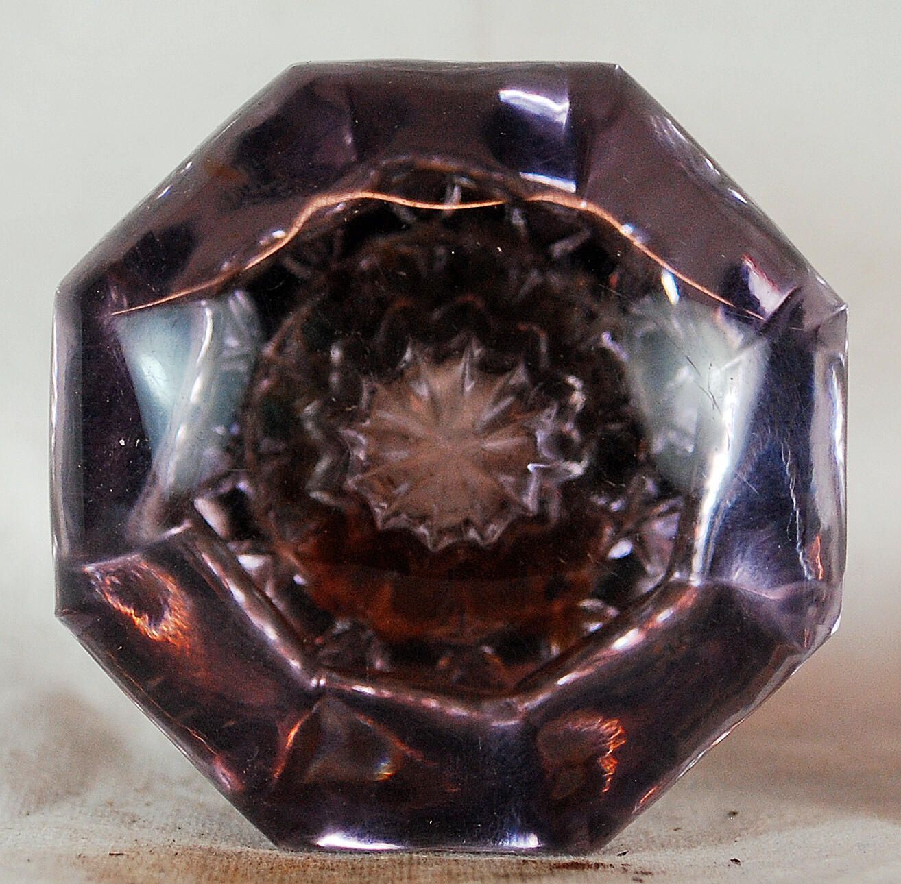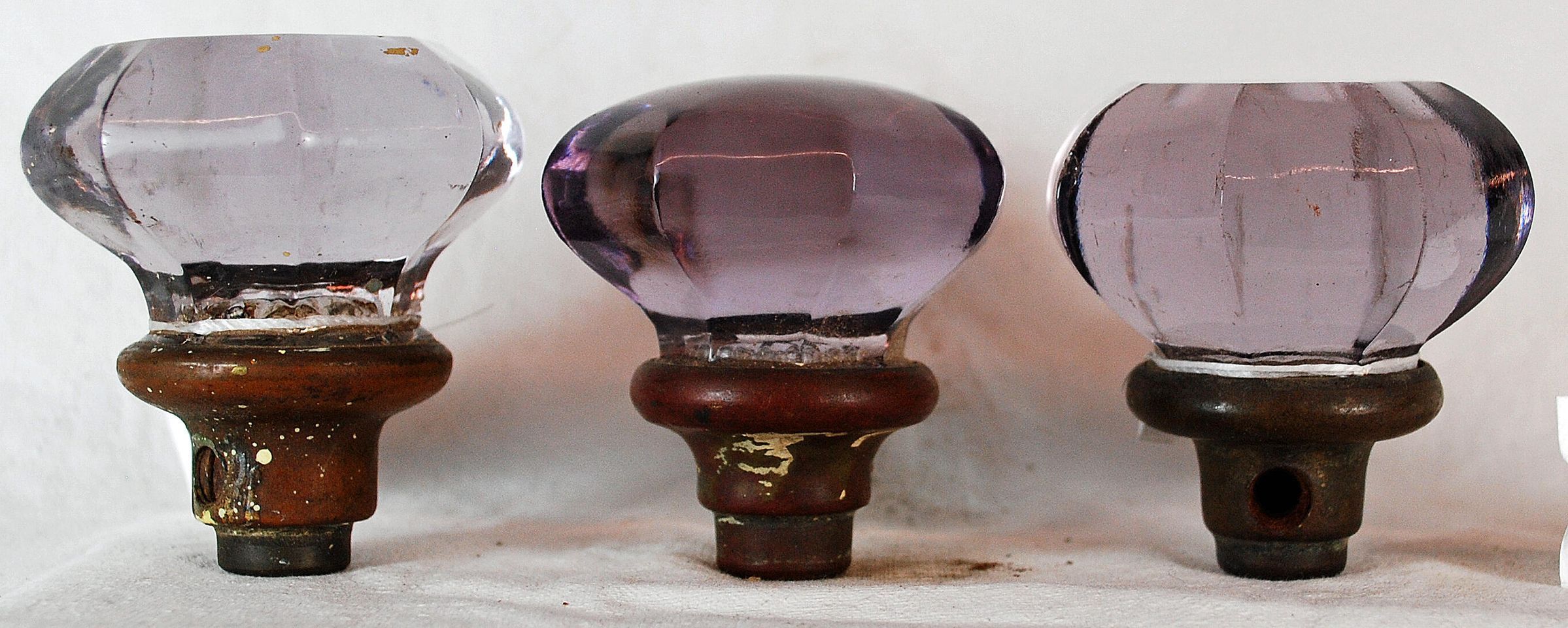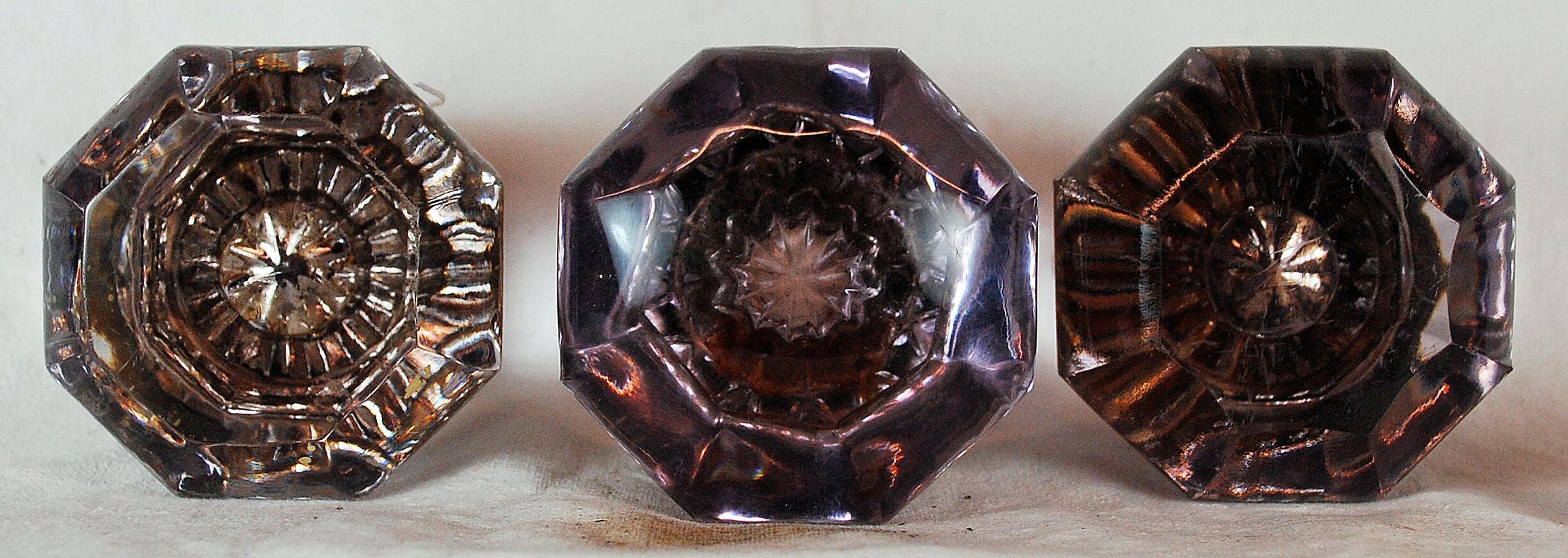 Design Name: Manufacture: Style: Material: Glass Manufacturing Method: Two Polished. One Domed. Surface Finish: VDA Classification: Z VDA Number: Shape: Octagonal Patent Specifics: Lock Type (If Applicable): Inscription/Makers Mark: Inscription Text: : Comments: Sun Knobs. Amethist Color. Lot of Three.