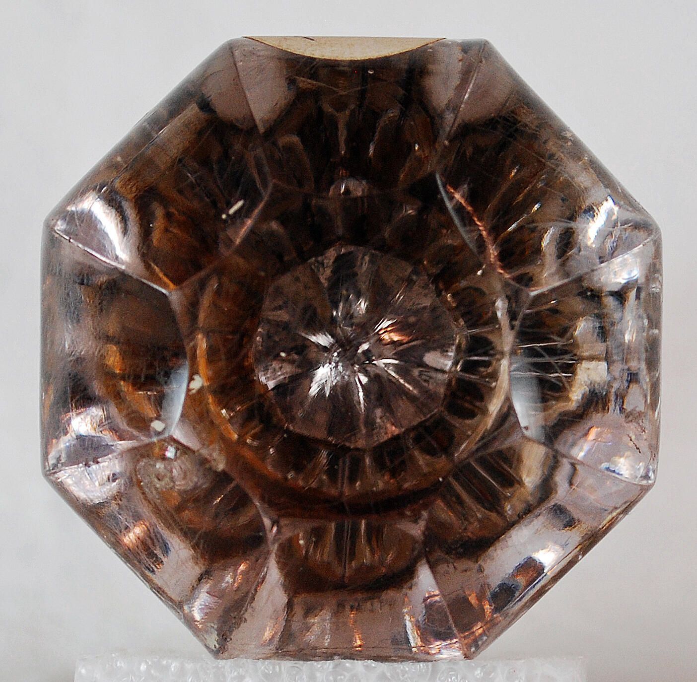 Design Name: Manufacture: Style: Material: Clear Glass Manufacturing Method: Pressed Surface Finish: VDA Classification: VDA Number: Z Shape: Octagonal Patent Specifics: Lock Type (If Applicable): Inscription/Makers Mark: Inscription Text: : Comments: Polished Face. Fluted Face Createse Star Shape. Chipped.