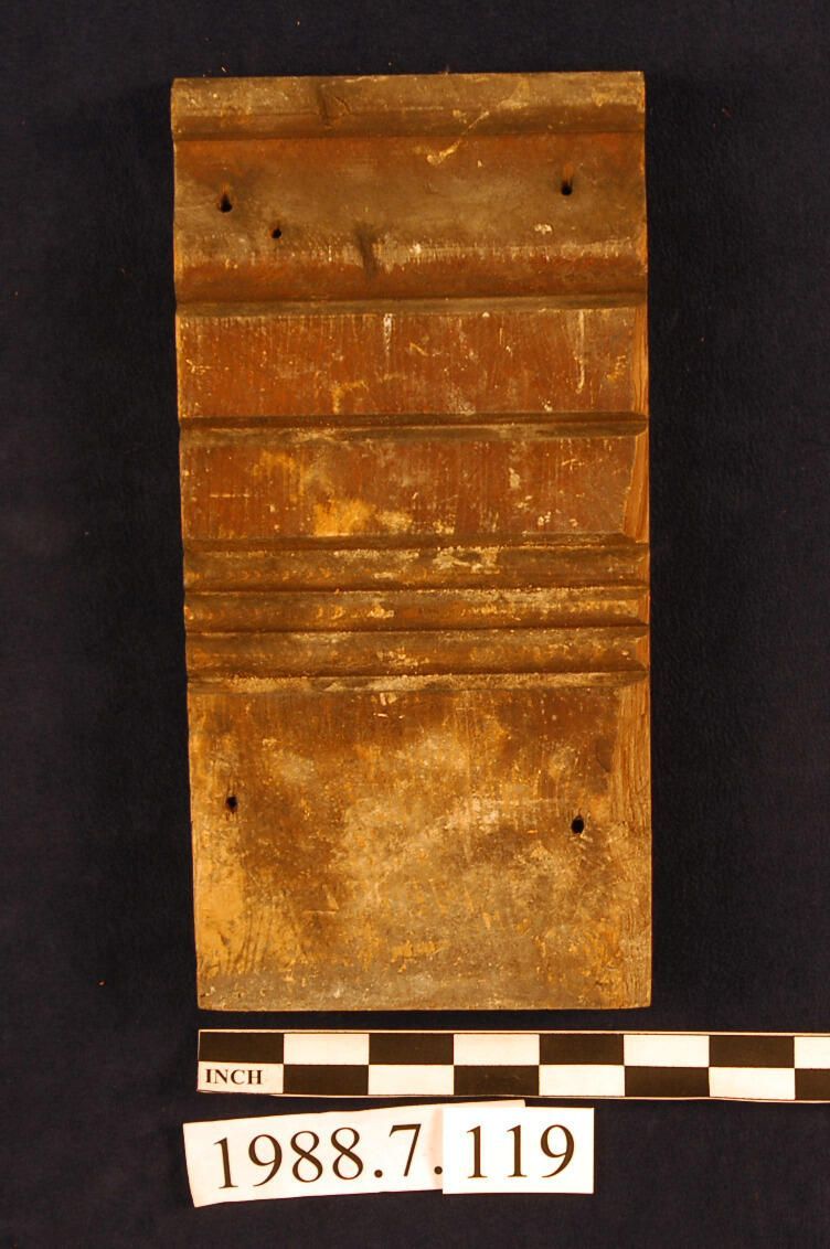 Rectangular corner block. Compound molding profile. Plain base. Cedar. Varnished. Inscriptions or Markings: Manufacturer: Place of Manufacturer: Design motif: Style: Finish: Varnished.