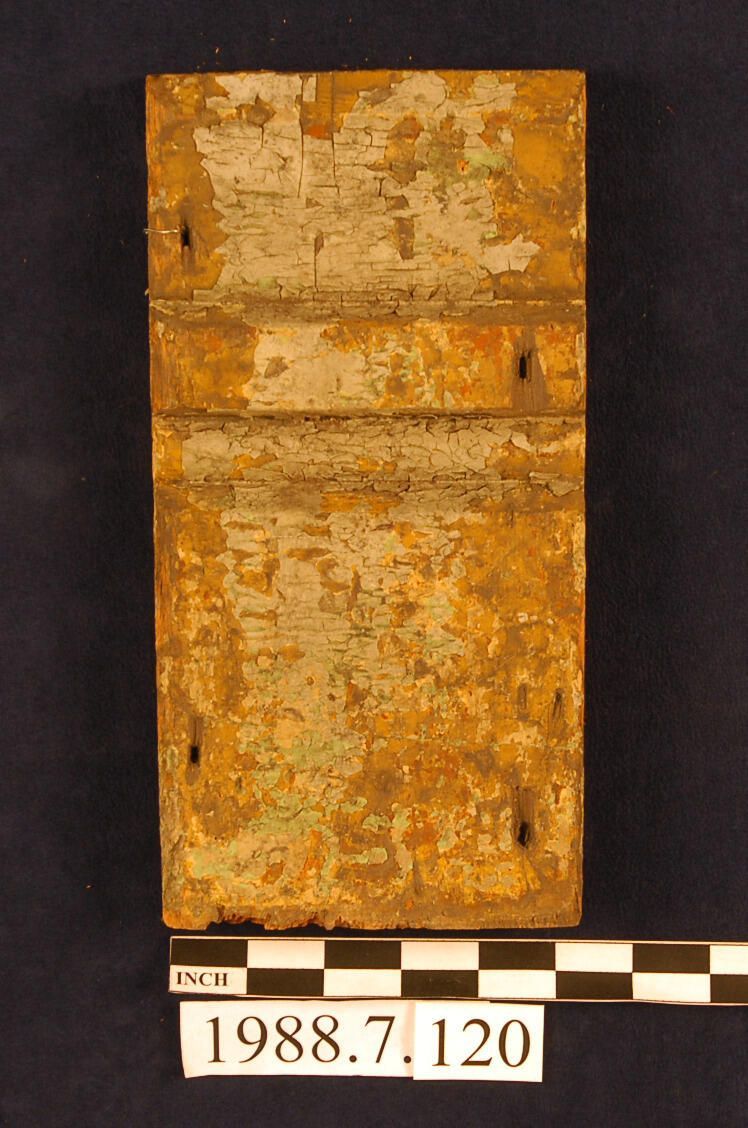 Rectangular corner block. Compound molding profile near top. Plain base. Cedar? Painted. Inscriptions or Markings: Manufacturer: Place of Manufacturer: Design motif: Style: Finish: Painted.