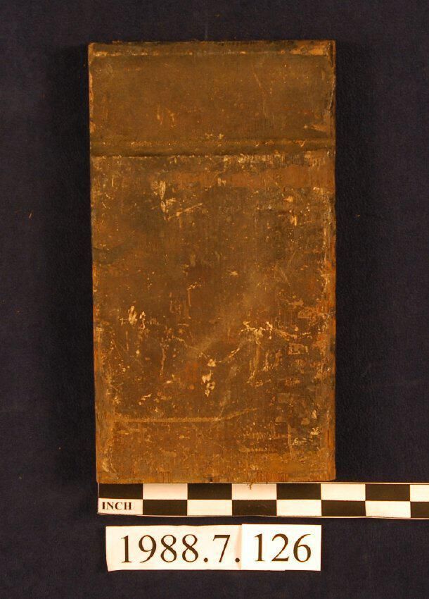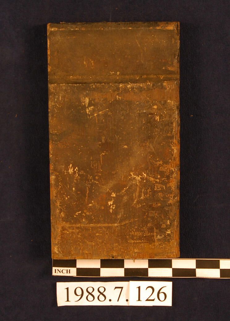Rectangular corner block. Compound molding profile near top. Plain base. Cedar? Varnished. Square nails. Inscriptions or Markings: Manufacturer: Place of Manufacturer: Design motif: Style: Finish: Varnished.