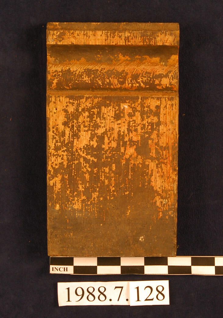 Rectangular corner block. Compound molding profile near top. Plain base. Unidentified wood. Varnished. Inscriptions or Markings: Manufacturer: Place of Manufacturer: Design motif: Style: Finish: Varnished.