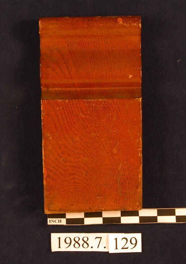 Rectangular corner block. Compound molding profile near top. Plain base. Unidentified wood. Varnished. Square nail. Inscriptions or Markings: Manufacturer: Place of Manufacturer: Design motif: Style: Finish: Varnished.