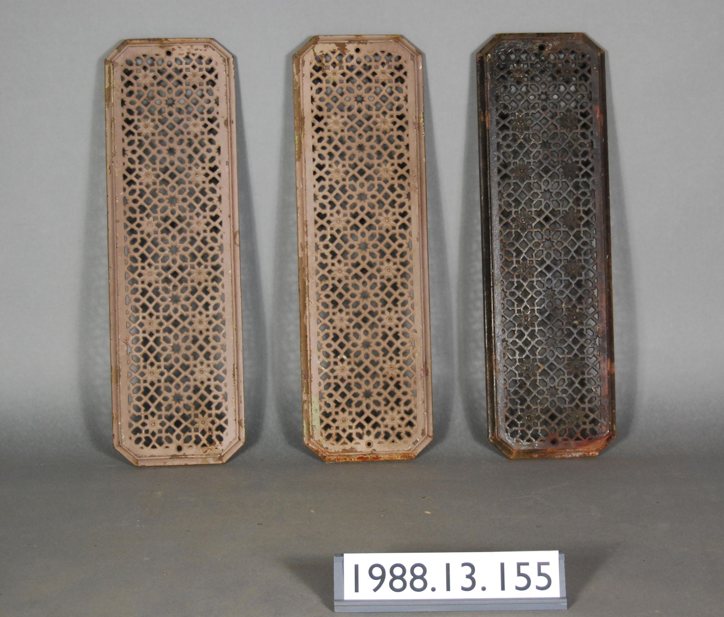 One lot of three radiator grilles or shelves. Cast iron. Open filigree. Botanical and lattice motifs. Flanged edges with angled corners. Painted lavender / bronze colored.