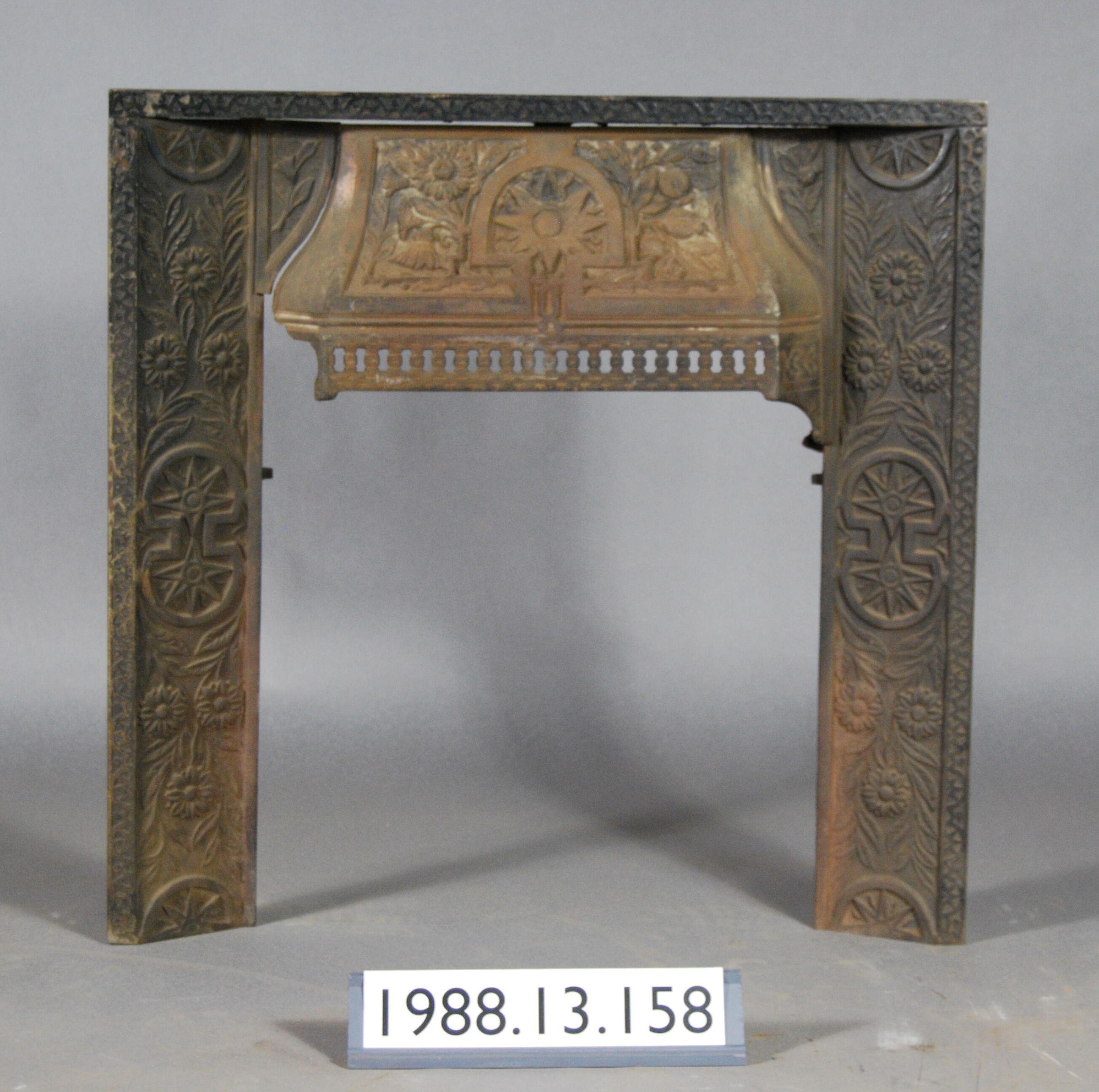 Cast iron. Rectangular frame. Central hood (piece missing - cracked). Embossed floral / sunburst motifs. Three component parts bolted together. Detached section of firebox.