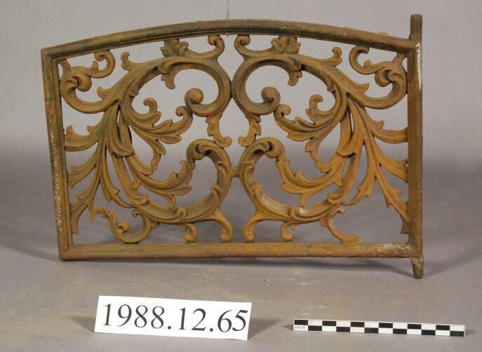 Cast Iron gate. Rectangular frame. Scrolled botanical motif. Hinge pivots on one edge. Three eyelets on back. Remnants of black paint. Inscriptions or Markings: Manufacturer: Place of Manufacture: Design motif: Botanical. Style: Finish: Painted.