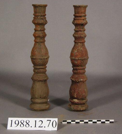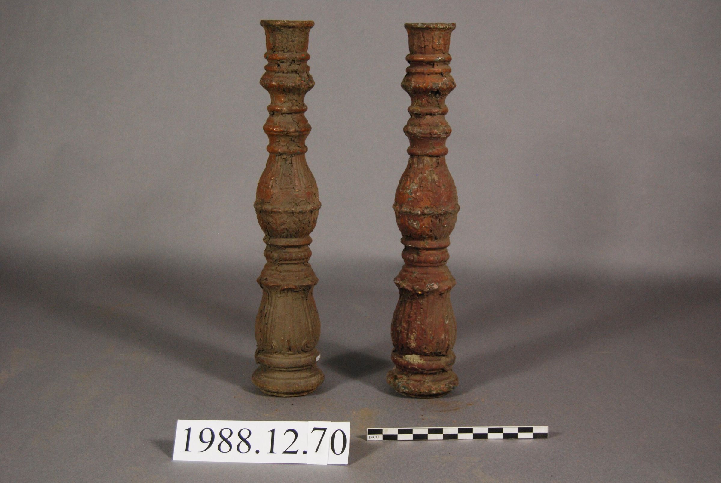 One lot of two cast iron fence posts. Hollow. Baluster shaft with botanical motifs. Beaded collar. Missing finial or cap. Painted brown. Inscriptions or Markings: Manufacturer: Place of Manufacture: Design motif: Botanical. Style: Finish: Painted.