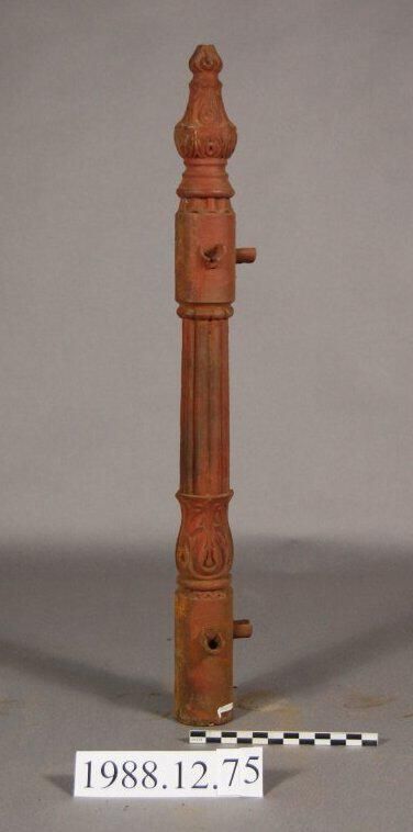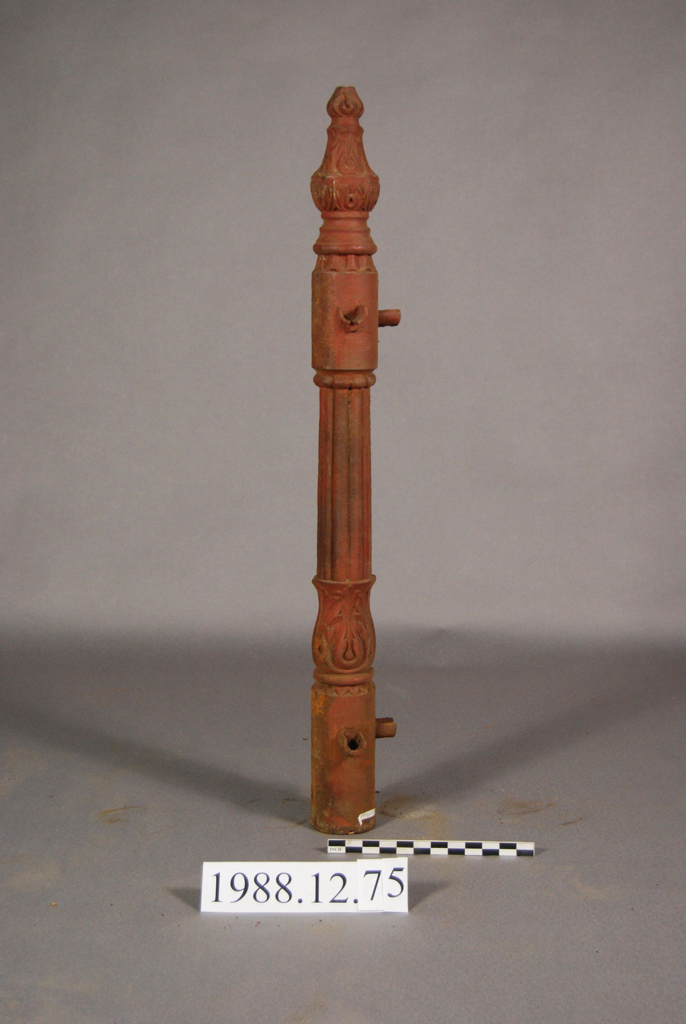 Cast iron. Hollow. Cylindrical base. Baluster column with botanical motifs. Fluted and beaded sides. Botanical motif top and finial. Two tabs on side. Painted red.