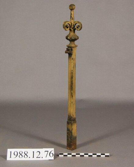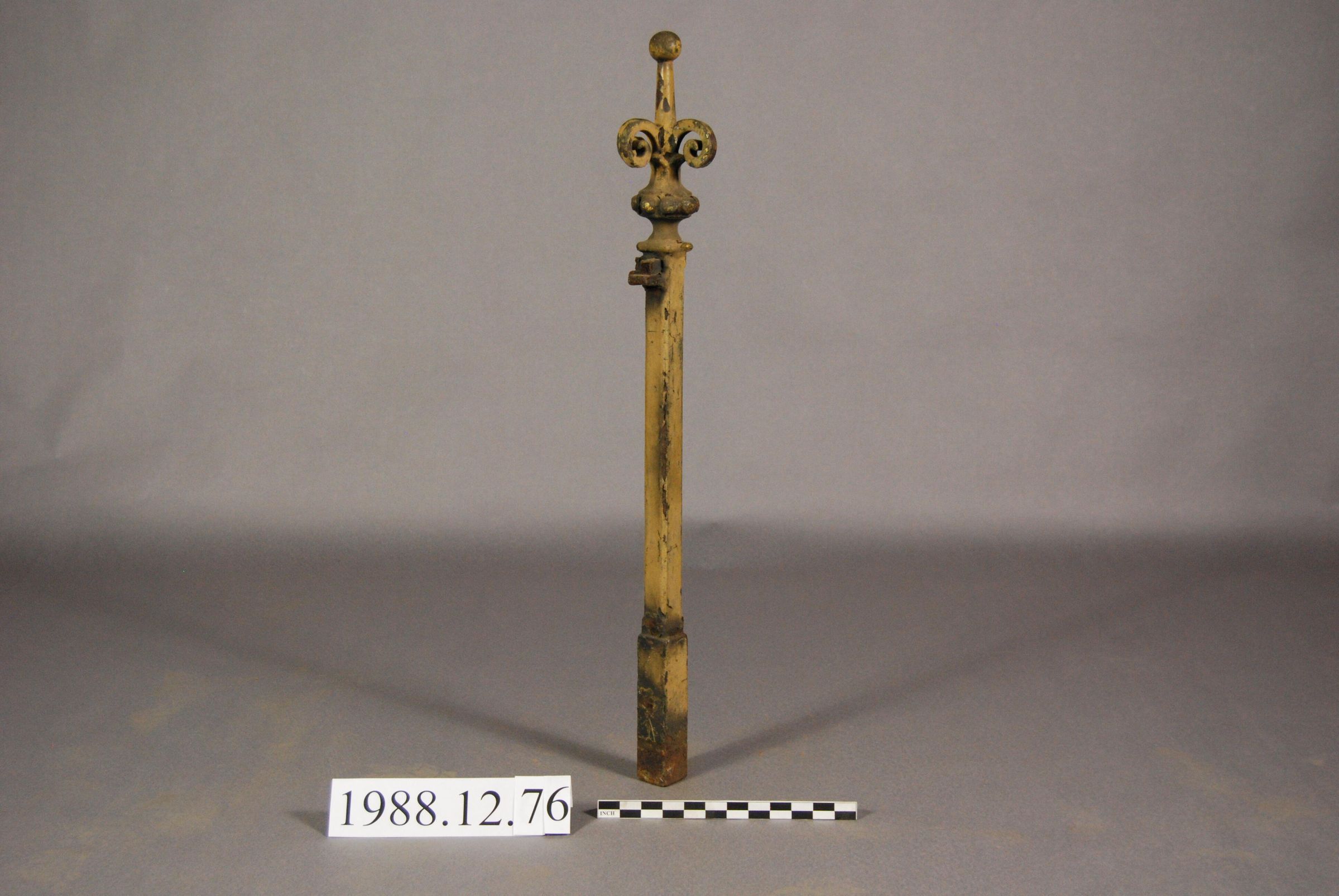 Cast iron fence post. Solid square shaft with stepped shoulder. Chamfered corners. Has bulbous finial with beaded perimeter. Botanical motif. Scrolled arms (one is truncated). Spire with ball top. Post has tabs on two sides. Painted beige over original finish which is gilded.
