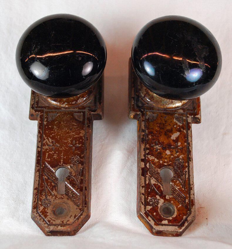 Comments: Matched Pair. Tag with name: "Prouty". Each with Jet Black glazed knob. Each with cast iron escutcheon,Lexicon