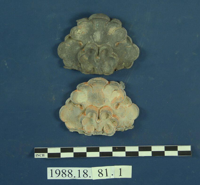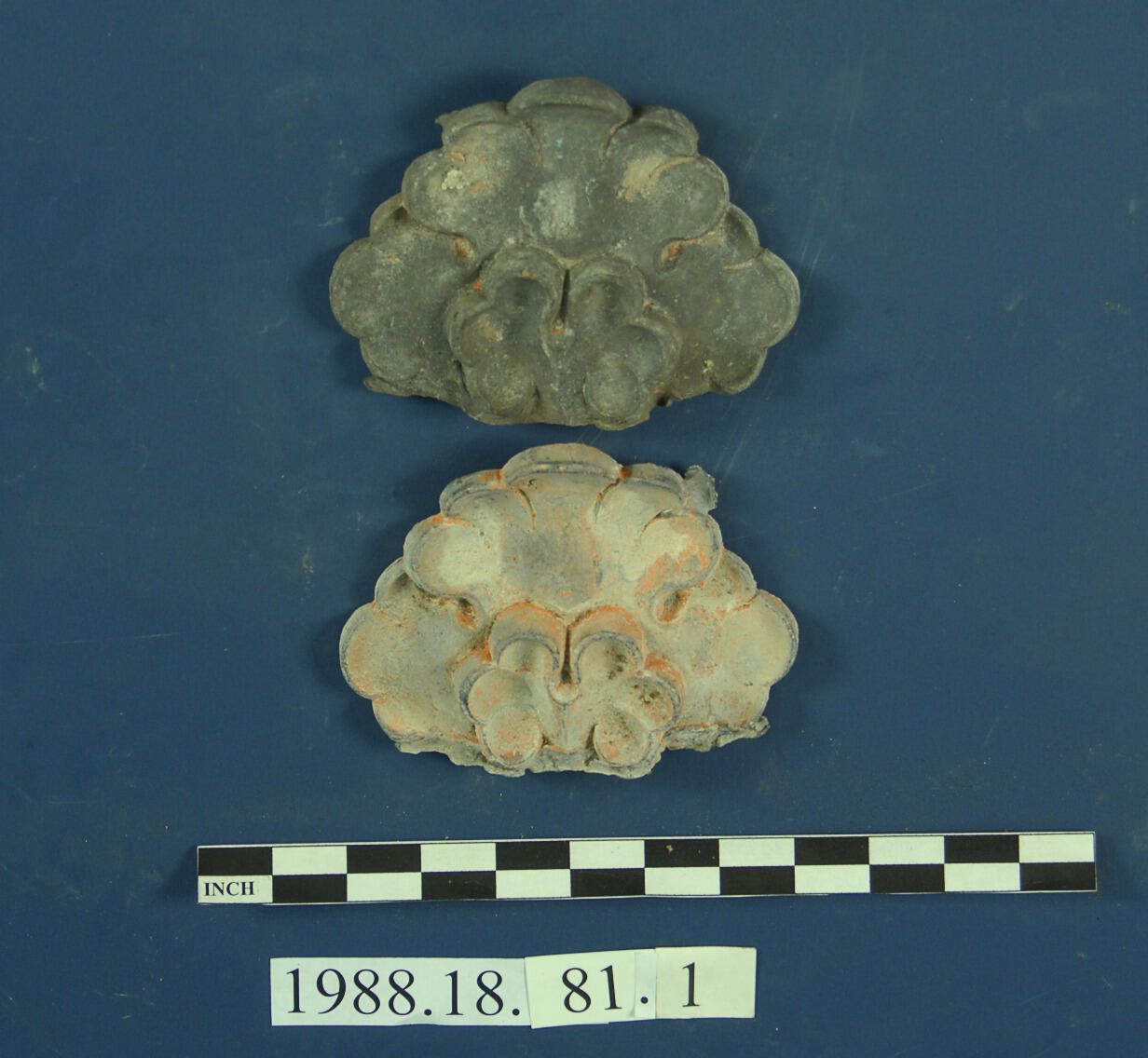 One lot of two cast zinc Ornaments. Botanical Motif. Remnants of red / orange paint. May match 1988.18.81.