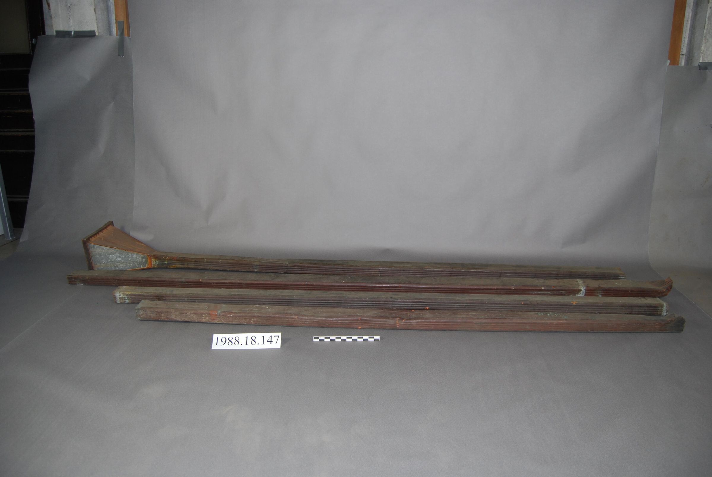 One lot of four cupreous down spouts. One of which has galvanized sheet iron pyramid shaped leader head. Down spouts are rectangular in cross section. Have corrugated surface. Soldered Joints.