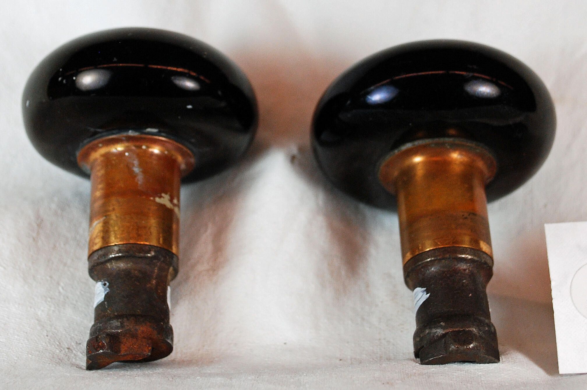 Design Name: Manufacture: Niles-Chicago Hardware Co.? Style: Material: Iron / Brass / Common Pottery Manufacturing Method: Cast / Molded Surface Finish: Glazed VDA Classification: VDA Number: Shape: Domed Patent Specifics: Niles Patent Shanks Lock Type (If Applicable): Inscription/Makers Mark: Inscription Text: Comments: Iron and brass shanks. One knob loose.