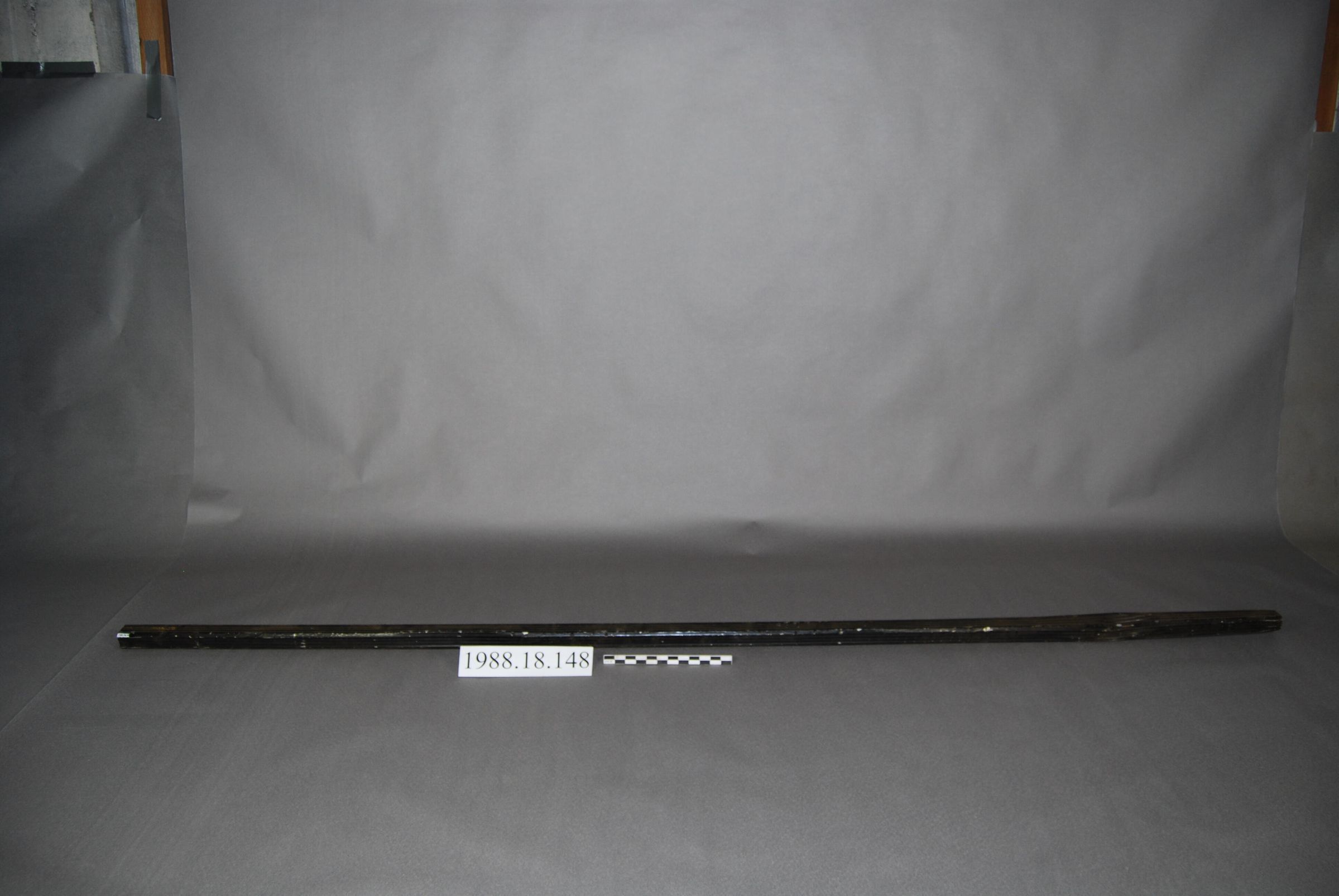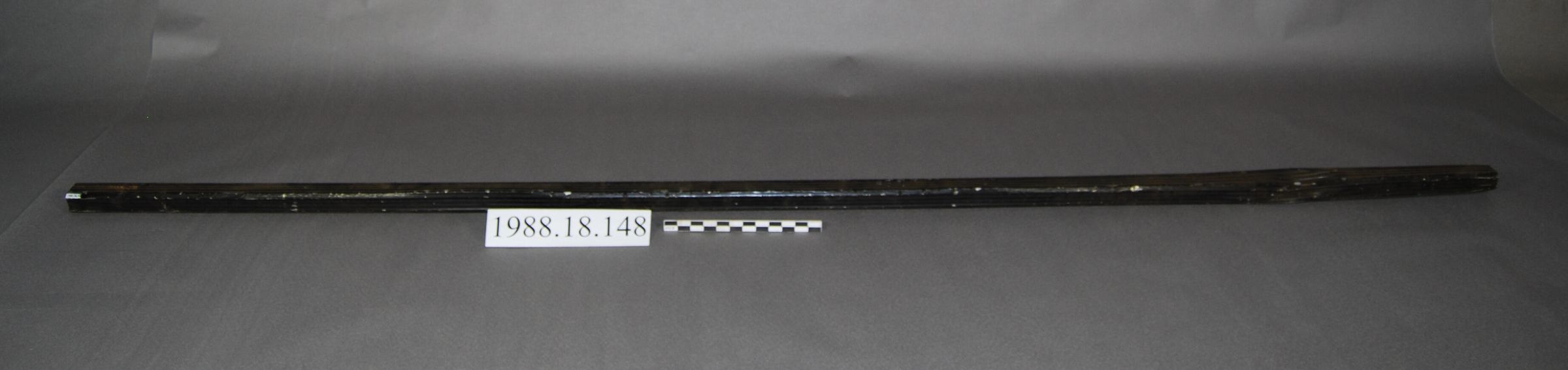 Galvanized sheet steel down spout. Continuous square cross-section. Tubular. Hemmed seam. Corrugated surface. Painted black.
