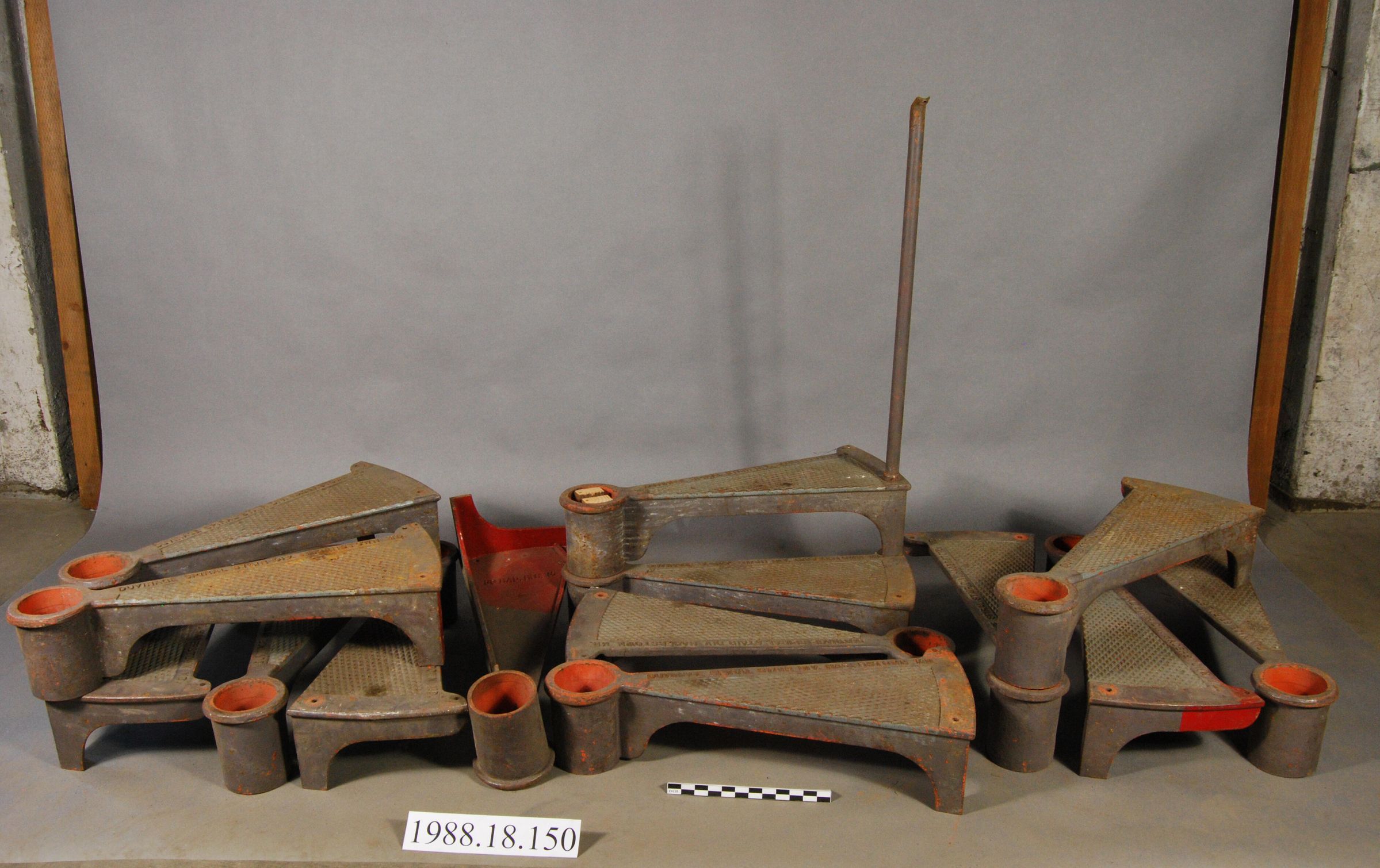 One set of fourteen cast iron spiral stair treads. Embossed diamond surface and manufacturer's trademark. Wedge shaped with cylindrical mount at radius point. Painted orange / red / grey.