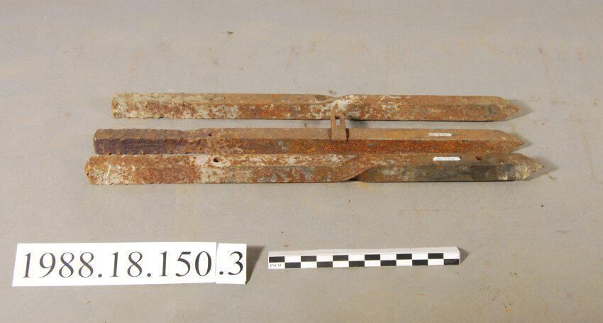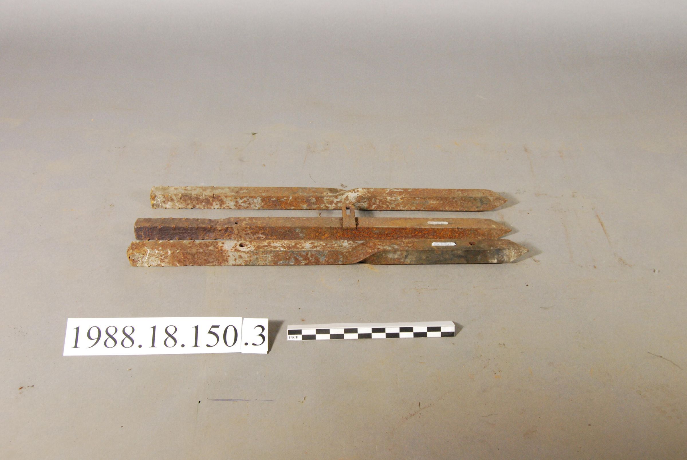 One lot of three 1.5 inch square iron/steel anchor bars. Assumed to be part of spiral staircase, for mounting to masonry. Barbs along one end of each bar. Pyramidal at other end. the bars have spiral twist. Other bar has welded bracket.