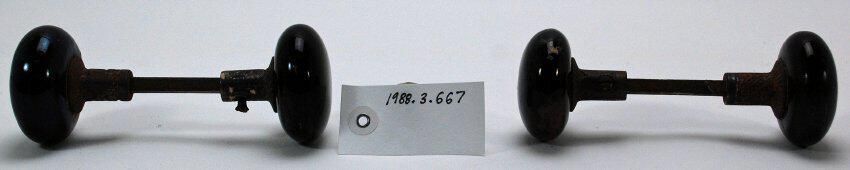 Design Name: Manufacture: Style: Material: Iron / Common Pottery Manufacturing Method: Cast / Molded Surface Finish: Glazed VDA Classification: VDA Number: . Shape: Patent Specifics: Lock Type (If Applicable): Inscription/Makers Mark: Inscription Text: Comments: Ornamental cast iron shanks. Jet black glazed knobs. Two spindles.