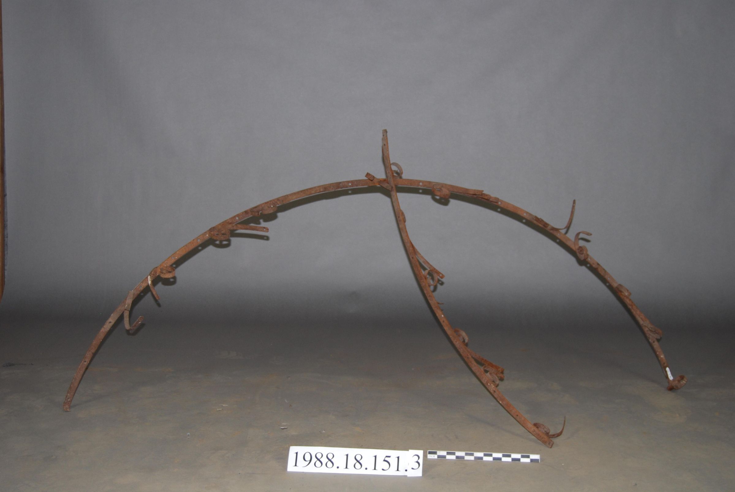 Set of two railing sections from spiral stair. Curved 7/8 inch bar with series of holes for mounting balusters. Has series of scrolled strap ornaments.