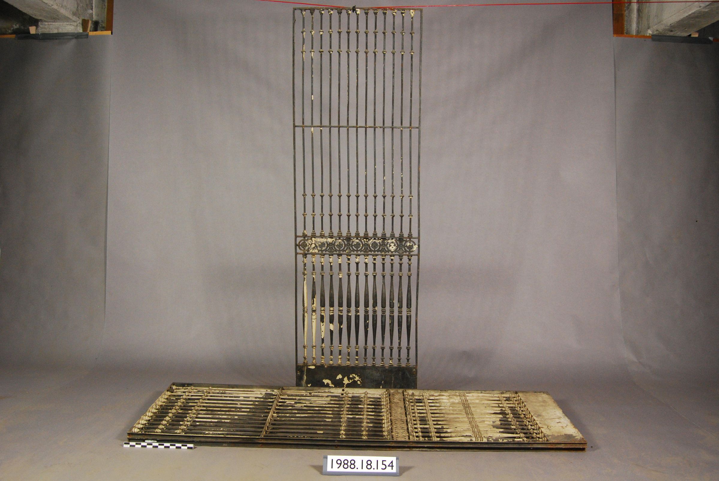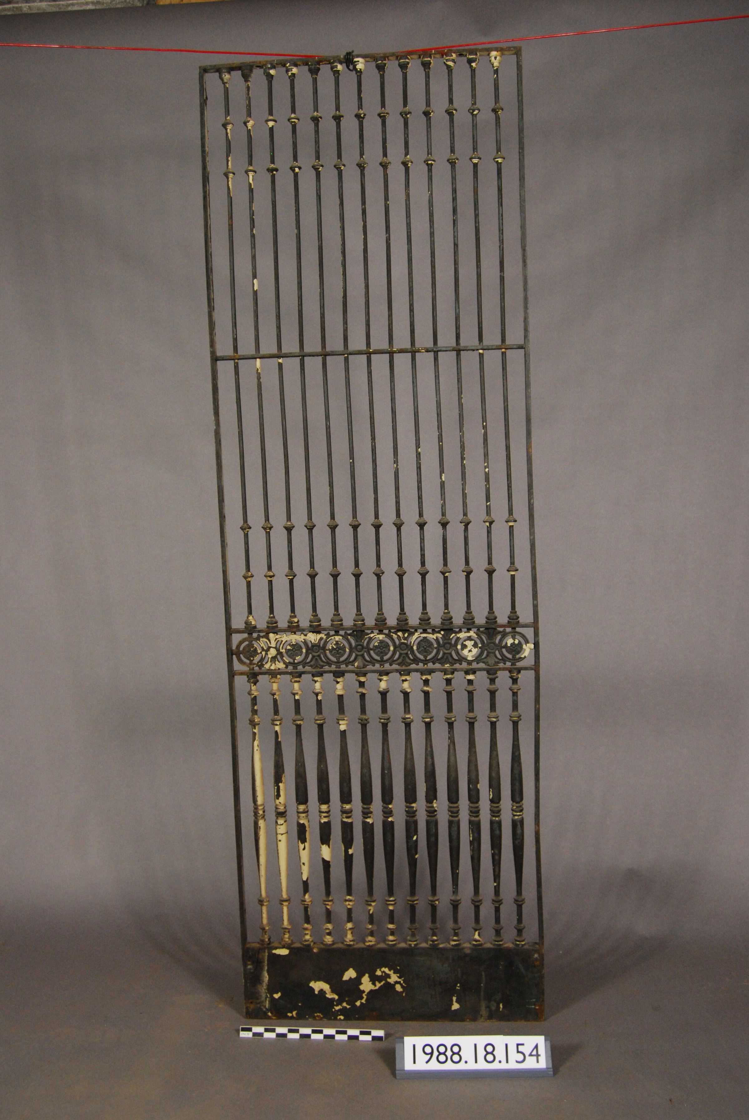 One lot of three ornamental iron grilles. Rectangular frame. Series of rods with cast iron balusters. Horizontal panel with open filigree. Botanical motif. Bottom of grille has base plate.