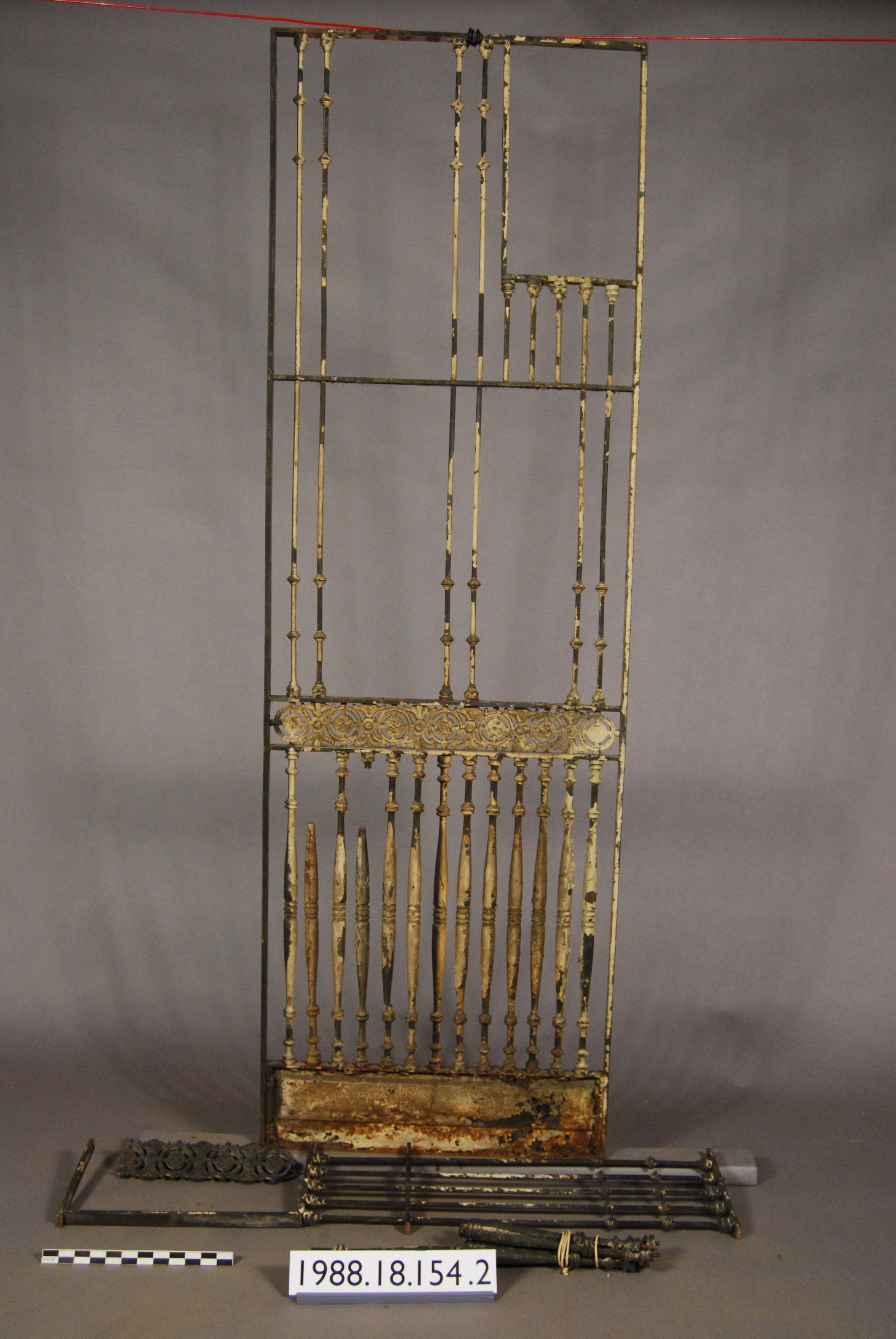 One incomplete ornamental grille with rectangular frame, series of rods with cast iron balusters, horizontal panel with open filligree botanical motif. Bottom of grille has base plate. One lot of broken / cut fragments from ornamental grille. Includes frame segments, baluster and horizontal panel parts.One fragment is saw-cut panel segment with botanical motif.