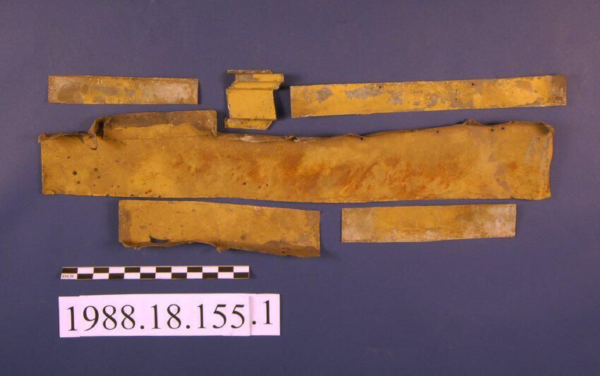 One lot of six small sections of galvanized sheet iron / steel. Same tan colored paint as 1988.155 and 1988.156.