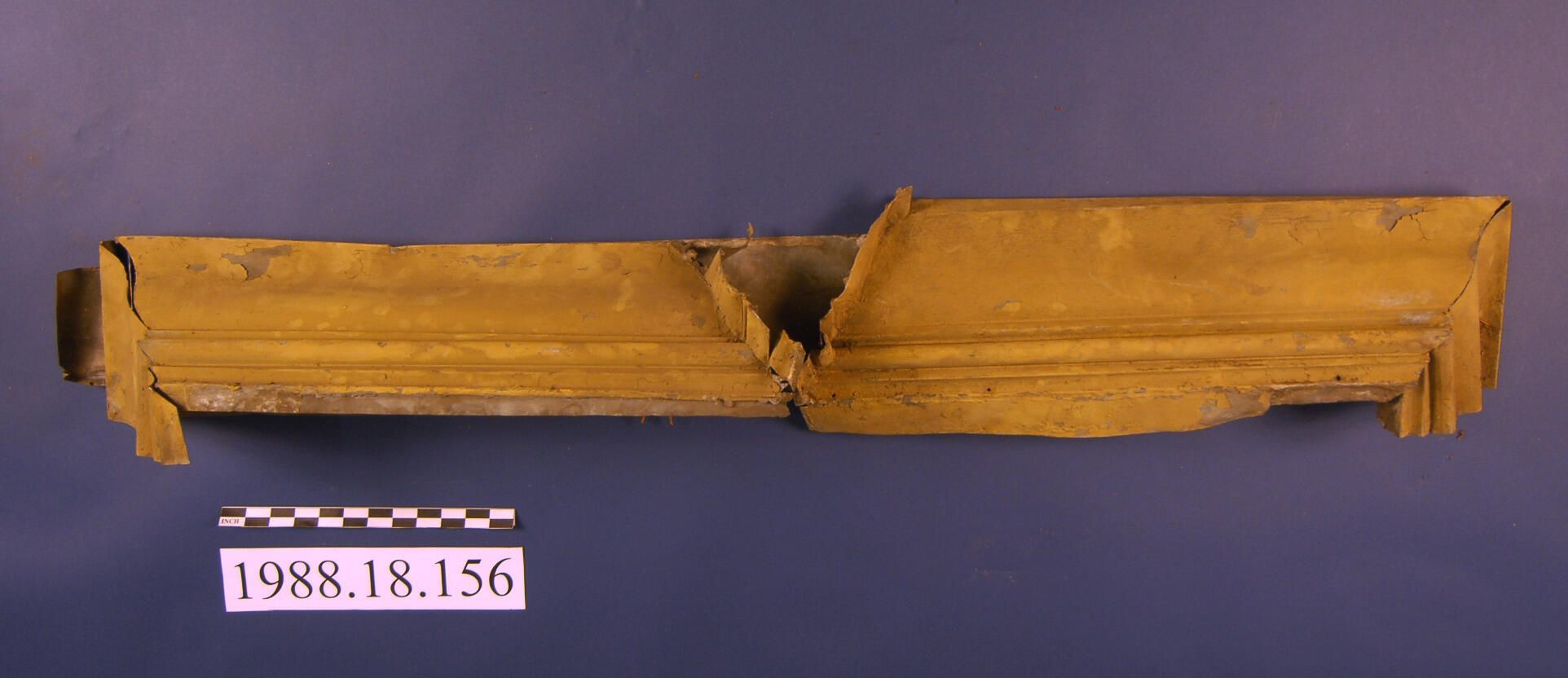 One lot of two galvanized sheet iron / steel cornice sections. Compound molding profile. Soldered joints. Tan paint matches 1988.18.155.
