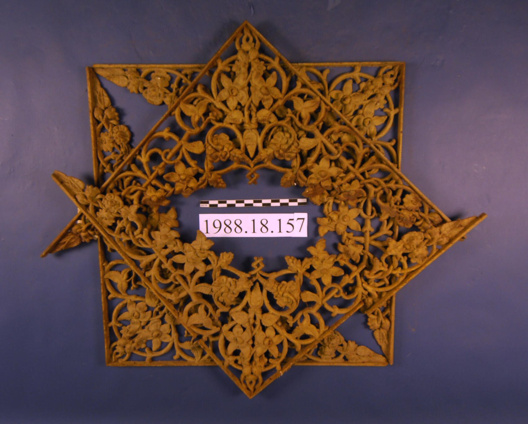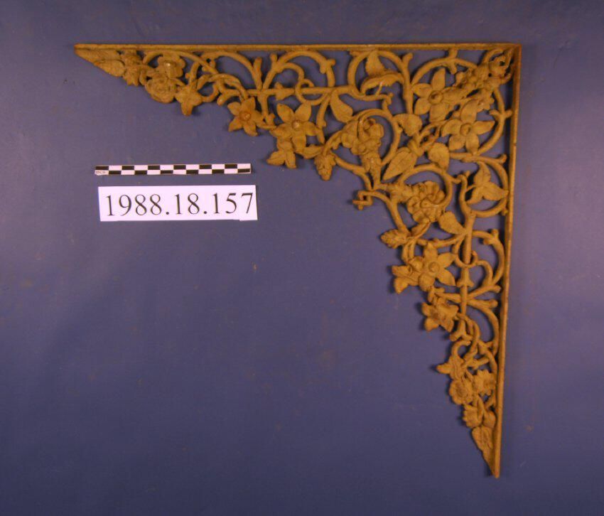 One lot of three cast iron brackets. Open filigree. Botanical motifs. Painted drab green.